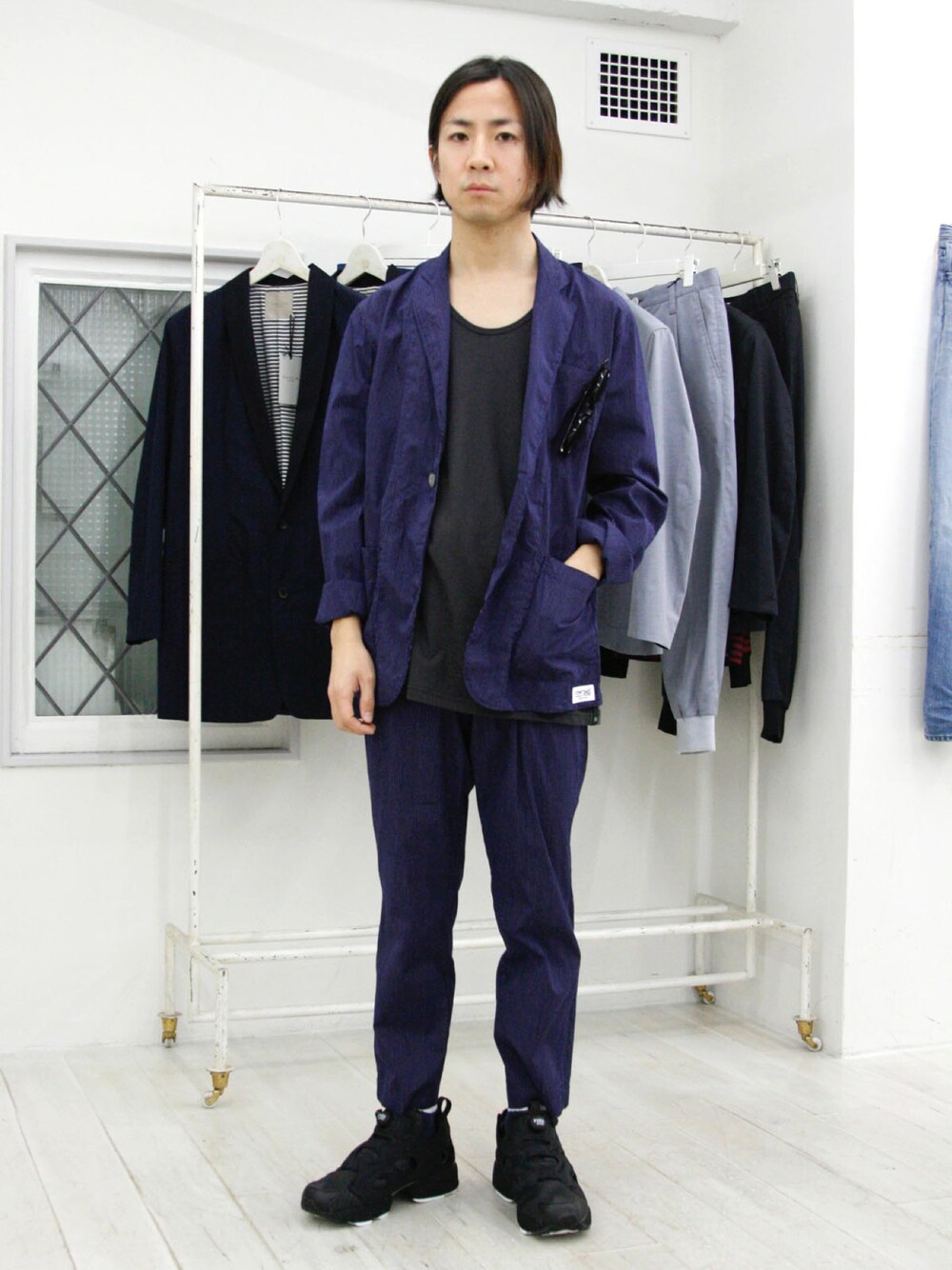 シャツ生地のセットアップに、先日リリースされたトリプルネームのポンプフューリー。 暖かい気候になってきたので、昼間はこれに軽いライトアウターでちょうどいいですね。