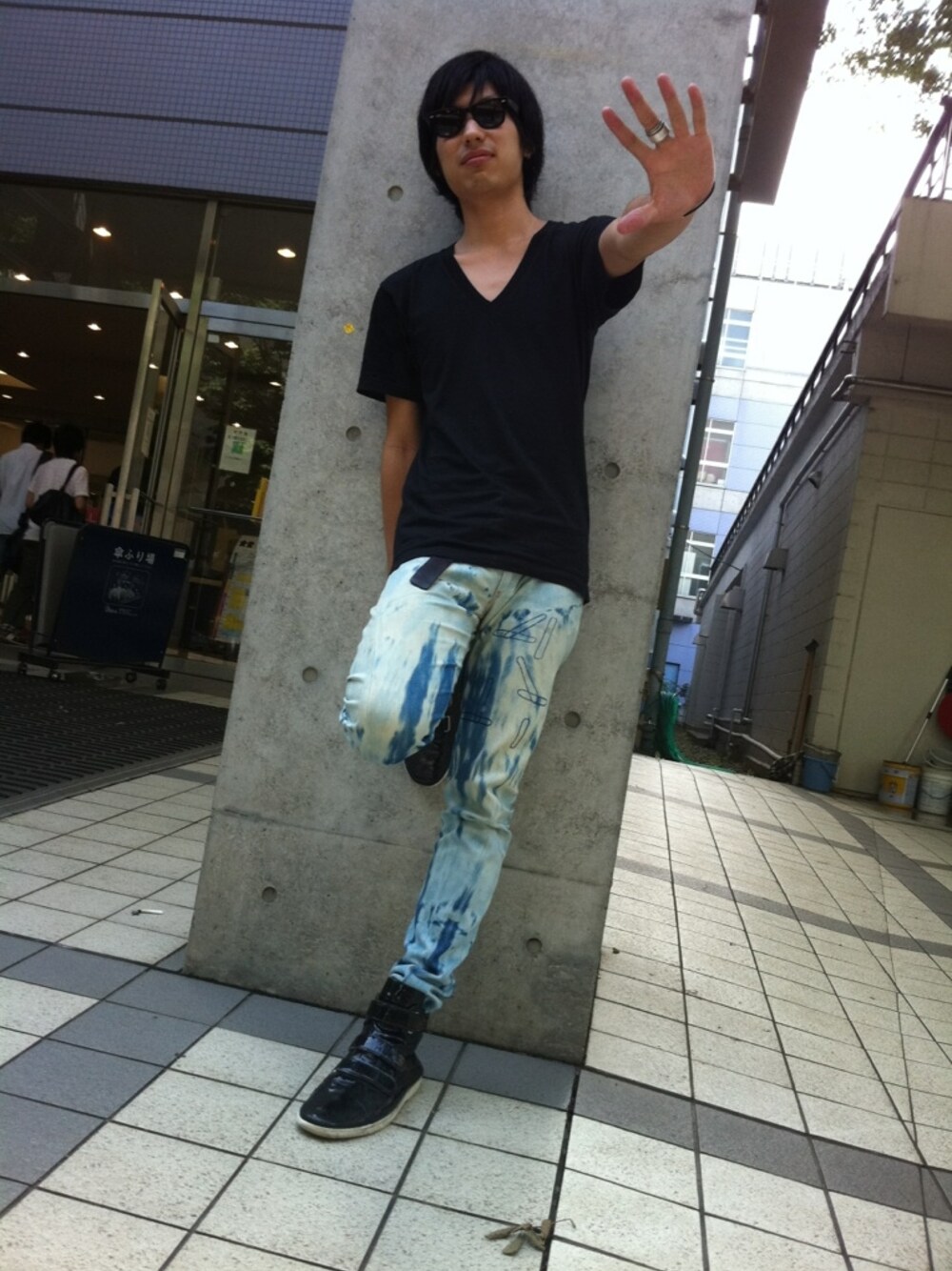 絶賛就活中 Tシャツ:American Apparel デニム:リーバイスレッド スニーカー:BELLY BUTTON サングラス:Ray Ban リング:Maison Martin Margiela