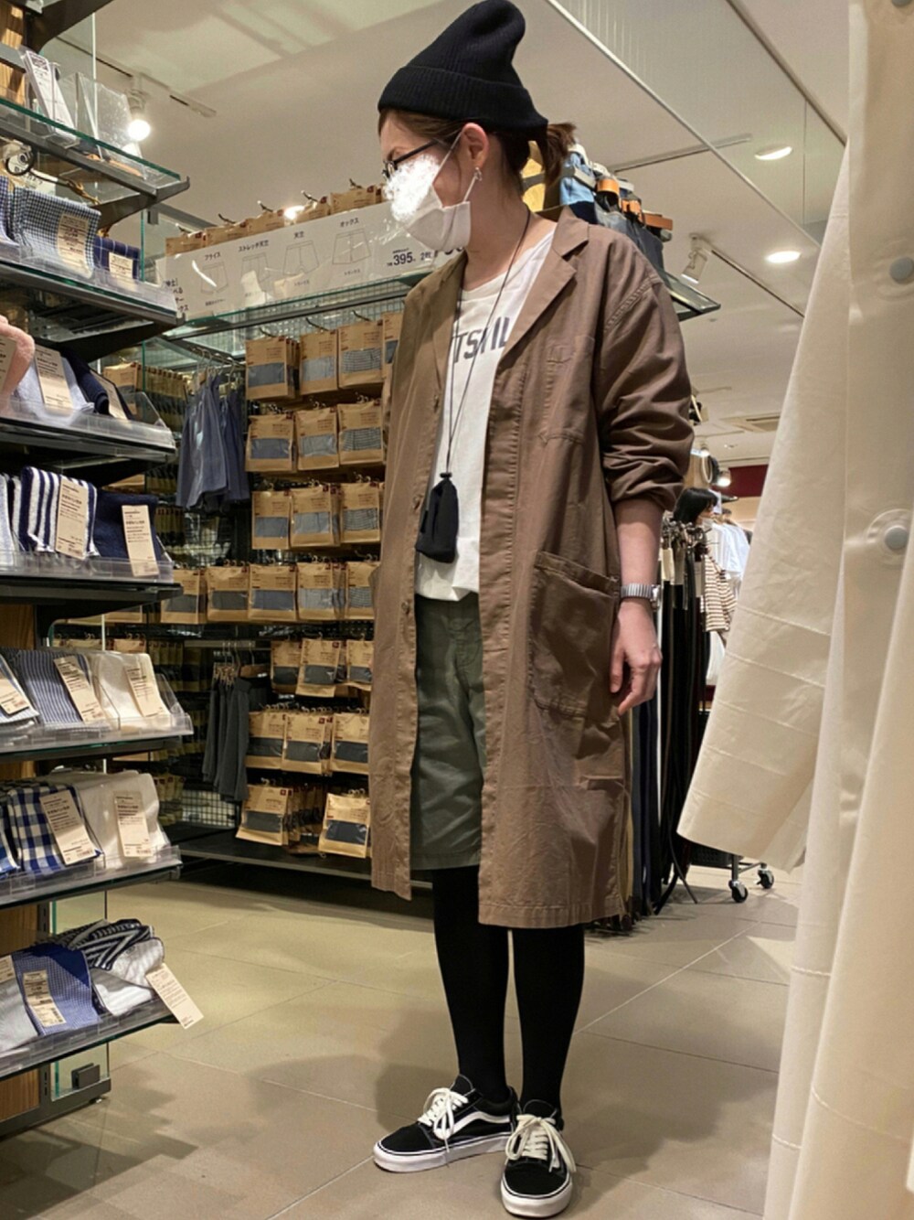 昨日のコーデに、無印良品のショップコートをプラス。 この時は試着ですが、この後しっかりGETしました笑 メンズS-M着用です。
