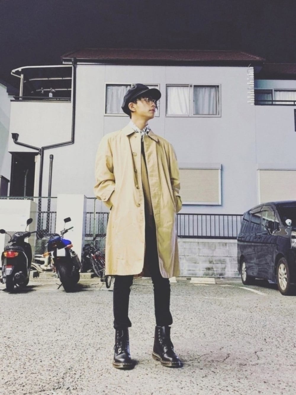 黒いキャスケットと丸メガネで韓国っぽさを出してみました👀 ちなみに靴は6㌢盛ってます💦