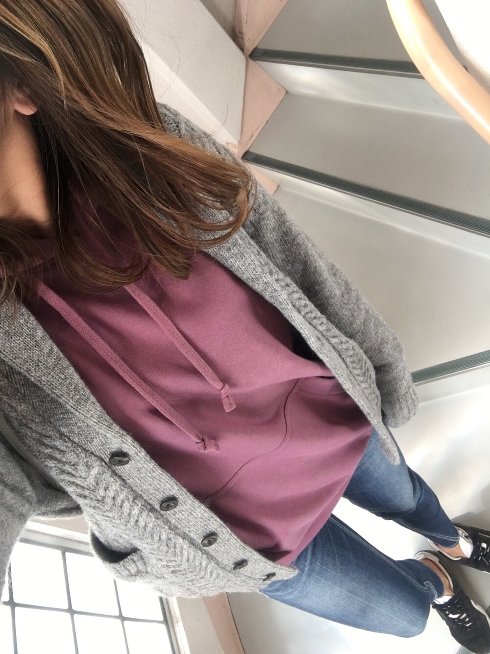 皮膚科の階段で撮りました🙃笑 てことで楽チンコーデ🤗 ピアスもしてまへん☺️ このカーディガンメンズのなんだけどゆったりでかわいい😋 しまむらのカウチン取り寄せしてもどっこにもなかった(笑) 全店舗売り切れってやばい😂😂笑