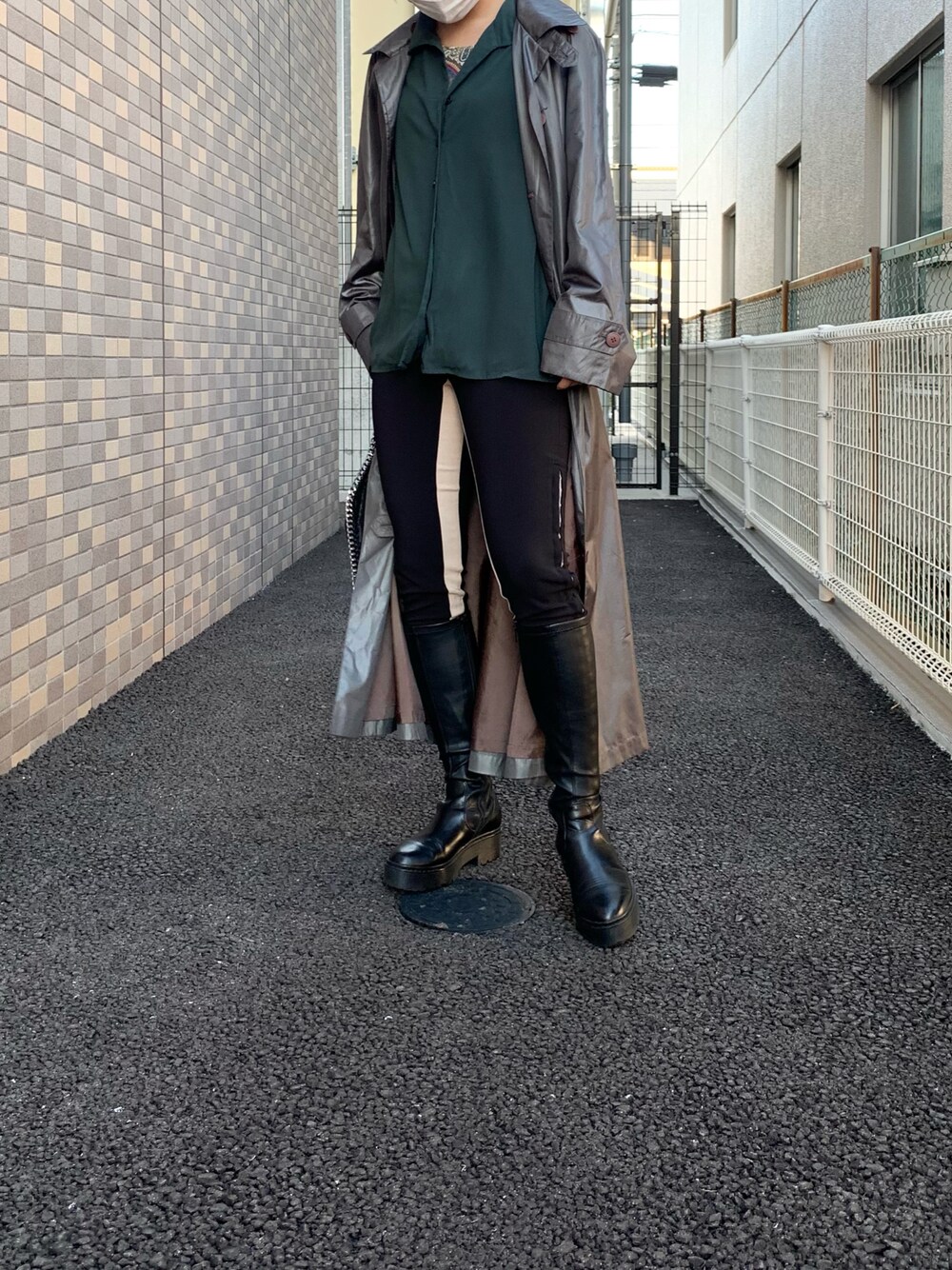 ご覧いただきありがとうございます💡 古着主体のコーデです。 新品とも合わせやすいアイテムたちで、グリーンがかったシルバーのコートがお気に入りです。 パンツは内側にベージュラインが入っていて細見えします。