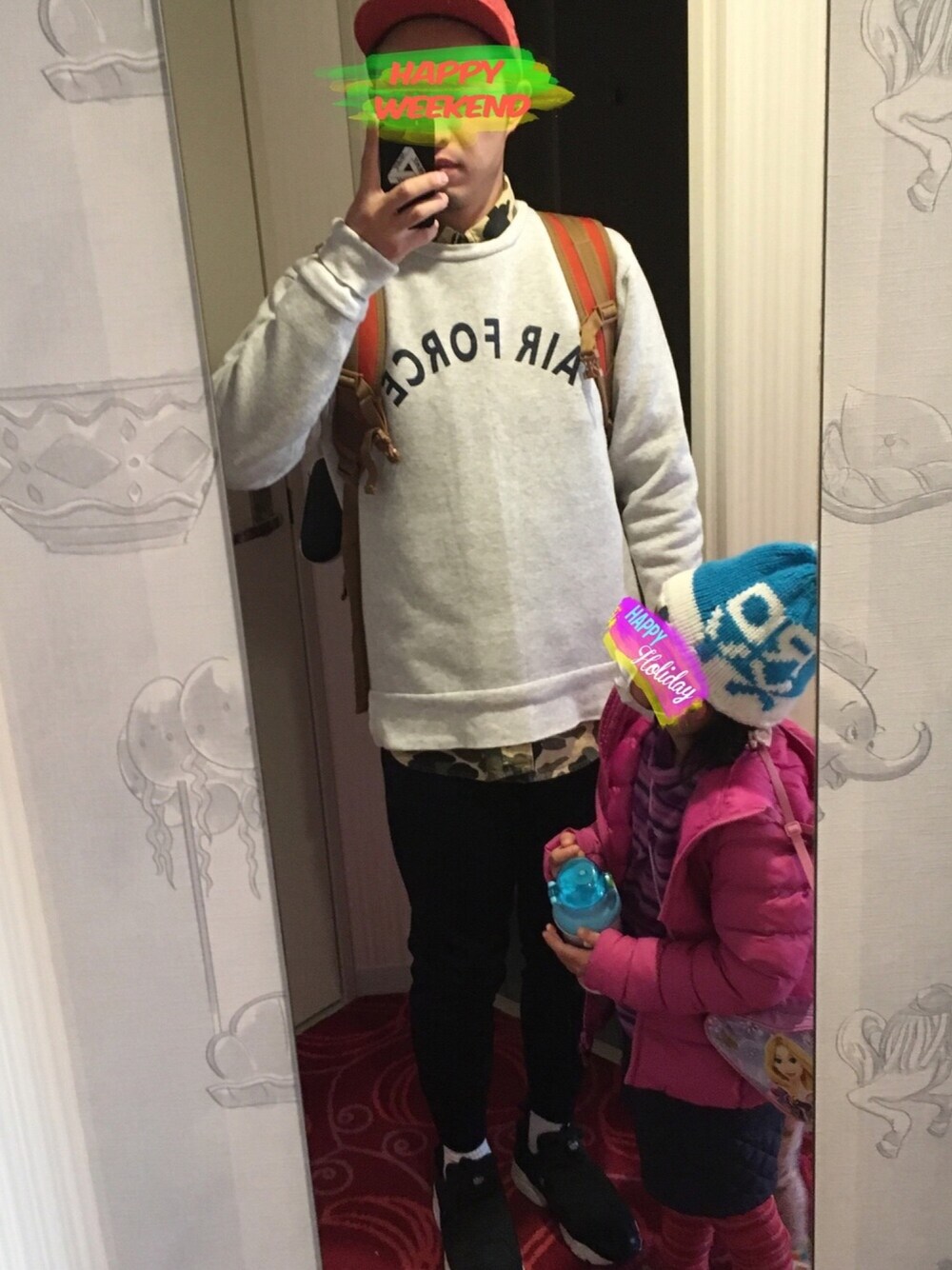 家族でディズニーシーに来ました! ディズニーホテルでの1枚です! 長女が割り込んできてます(-。-; この上にノースのマクマードで完全防寒!