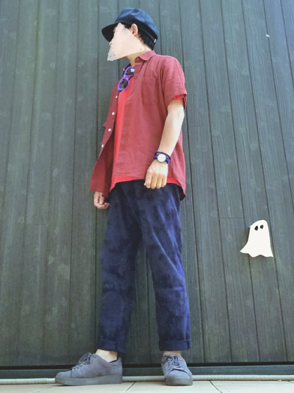 休日スタイルです。・・・といっても普段の通勤時と何ら変わりはありません(笑) 赤系のシャツのインナーにはもっと鮮やかな赤のTシャツです。 パンツは前回と同じネイビーの迷彩。意外とどんな色にも合います。