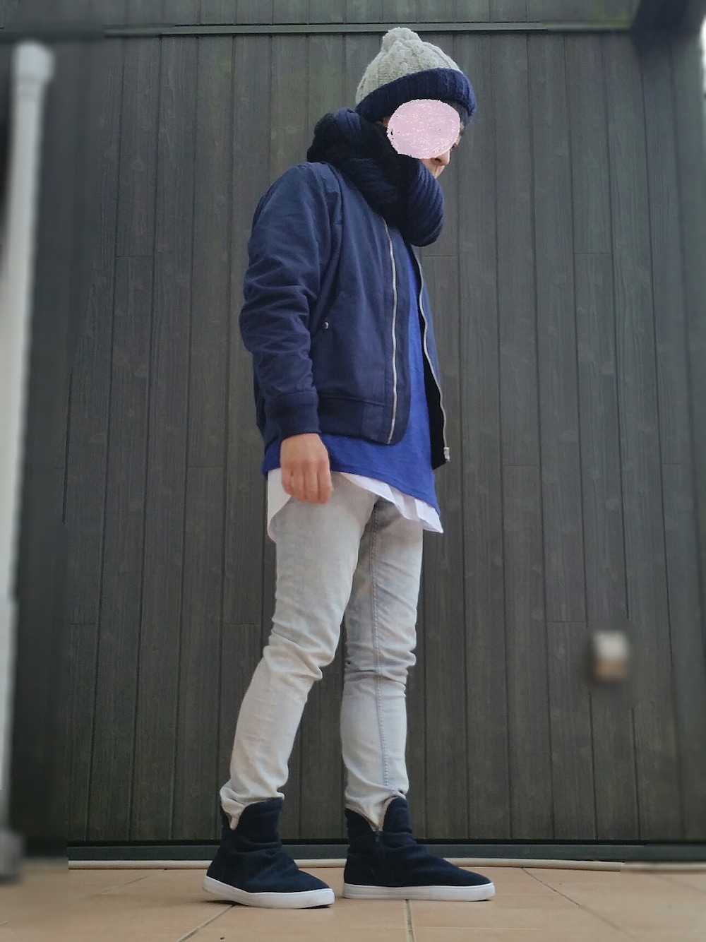 皆さんの真似して春っぽいコーデにしようと思ったんですが、やっぱりまだ寒いですね! というわけで小物で冬仕様に。 Wスヌード今回もしてます。わかりにくいですが黒xネイビーの2重巻きです。
