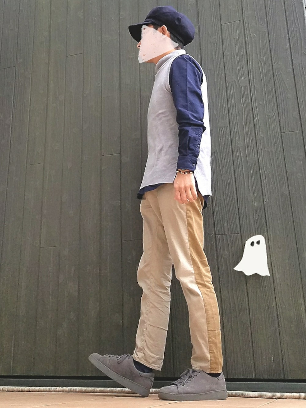 いんちょ。のベスト「12Gカシミアタッチ天竺モックネックベスト」を使ったコーディネート