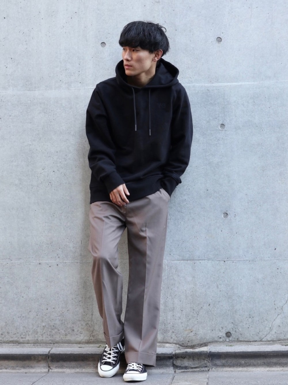 【コーデのポイント】 プルオーバーパーカーとワイドパンツの組み合わせです。 どちらのアイテムもダボっとしたサイズ感でいい感じにラフさが出せてるんじゃないかと感じます笑 あまりイメージ無いかもしれませんが、個人的にはY-3の出すプルオーバーパーカーはシルエットもフードの立ち方もかなり綺麗でオススメの一品です。 今期も何点か出てたのでよかったらチェックしてみて下さい!