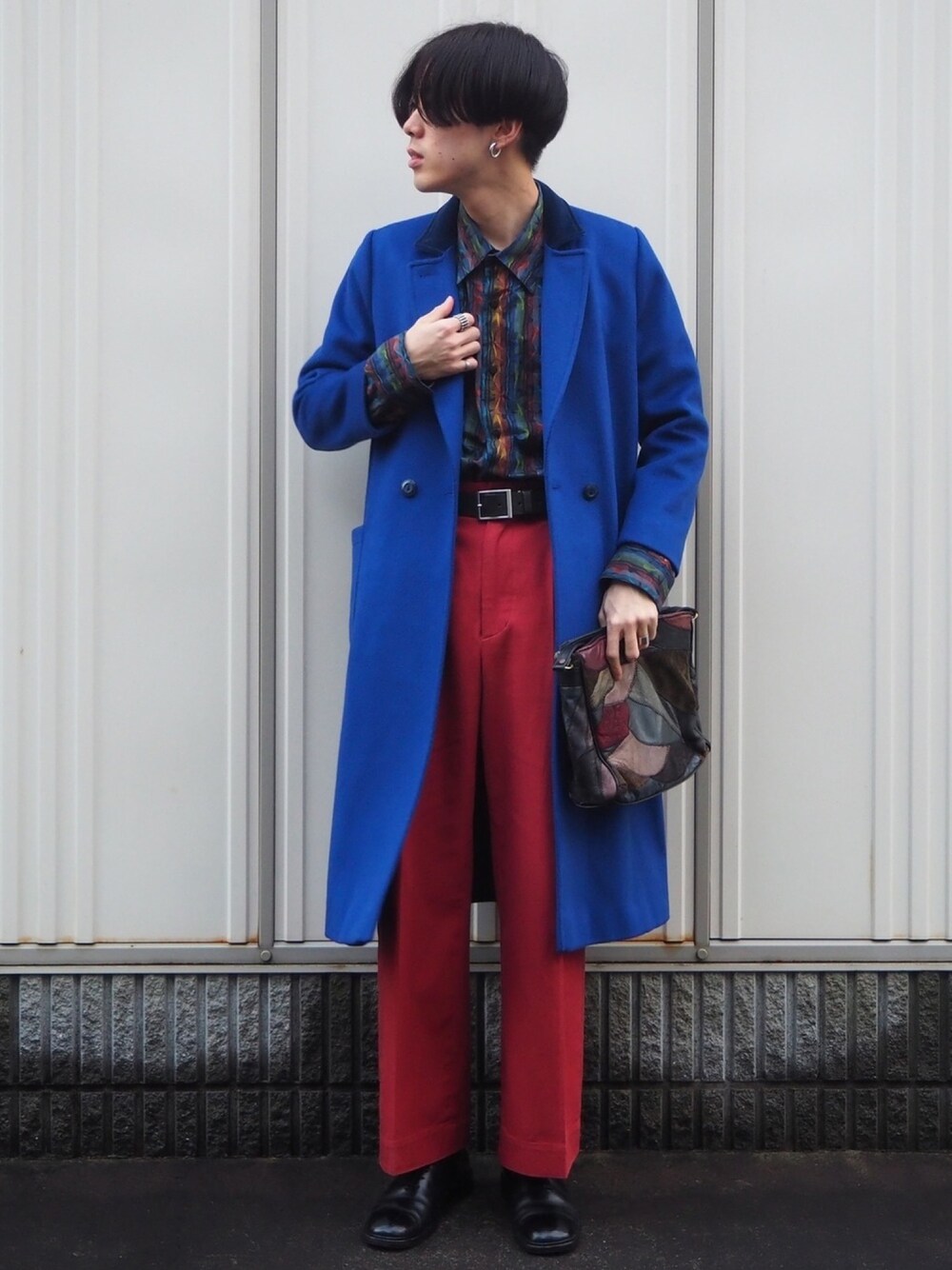今日はブルー×テラコッタ 久しぶりに色がごちゃごちゃしてます… 赤、青系という派手めなメインカラーですが、柄シャツや柄バックでその色を少しずつ拾うことでうまく繋げられたかなって思ってます😌 サーカスの人みたいな感じになりましたが、割と気に入りました笑
