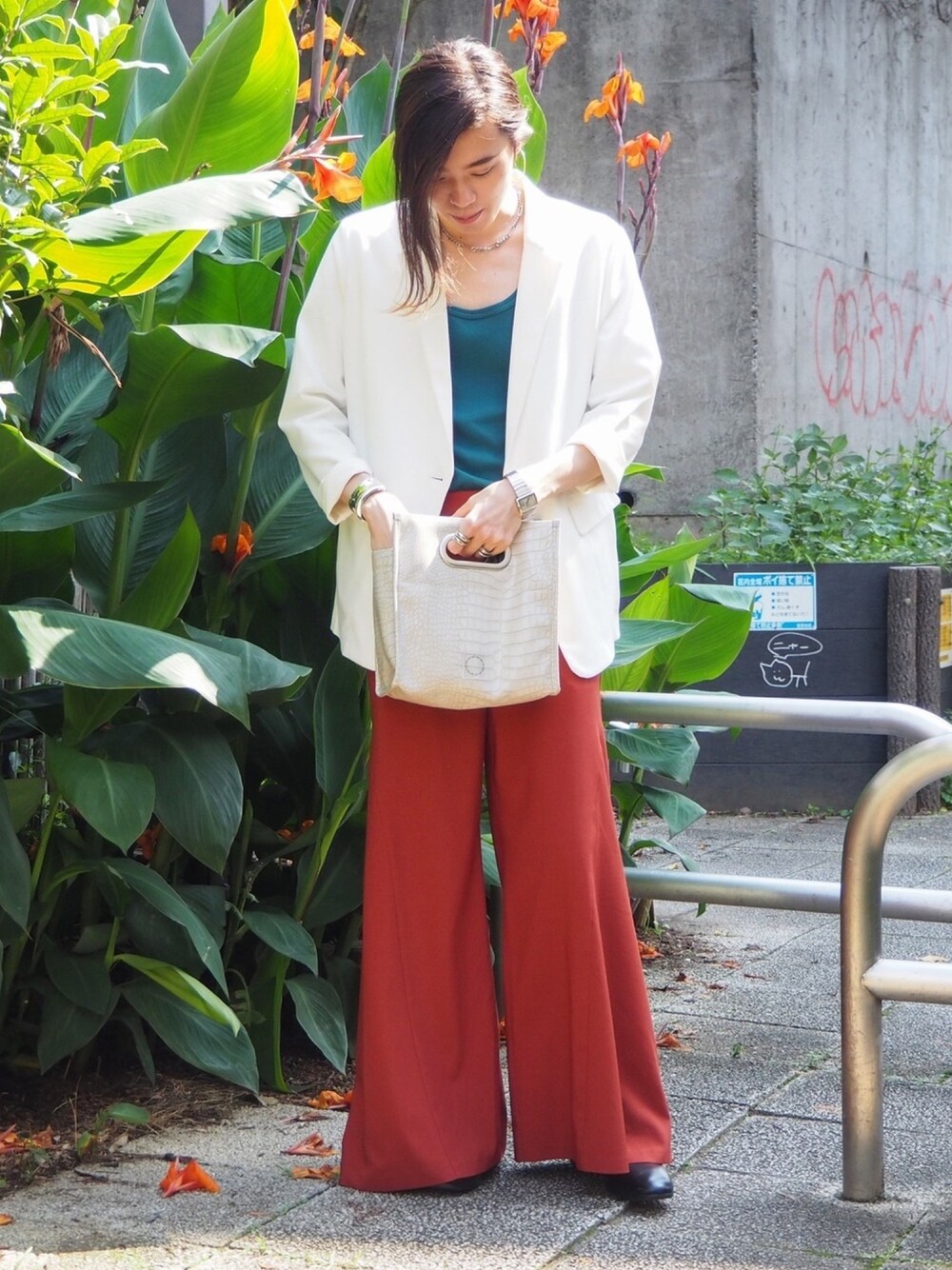 いつもいいね、お気に入りありがとうございます。 今日はホワイト×グリーン×テラコッタ ちょっと晩夏っぽい色合わせにしてみました🙆♂️ テラコッタの赤っぽさとグリーンは補色関係なんで、ちょっと主張強めの色ですが意外とすんなりまとまったかなと🙏