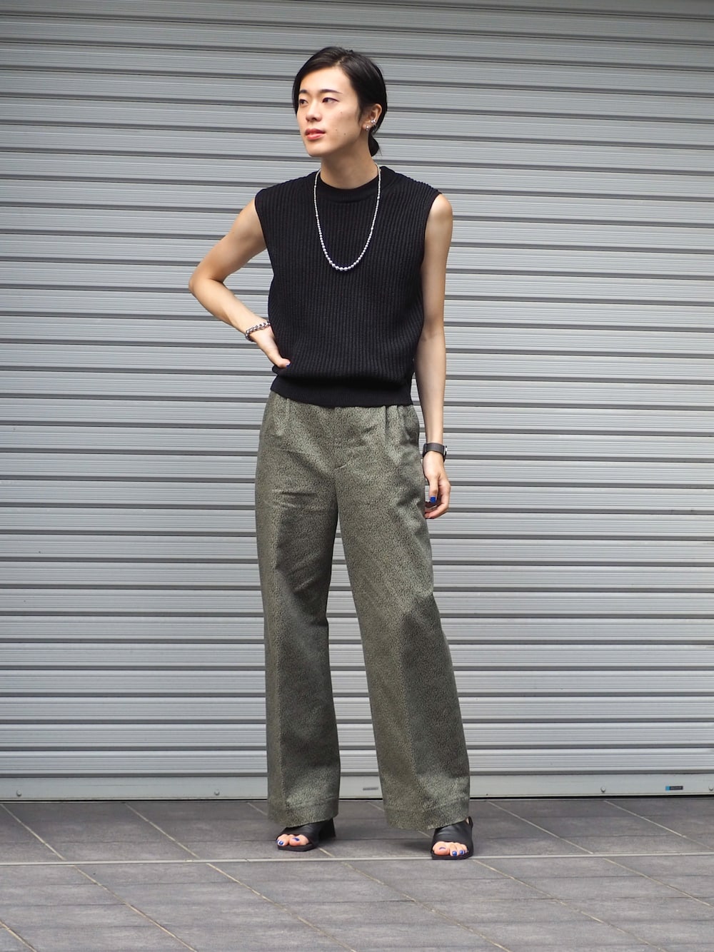 いつもいいね、お気に入りありがとうございます。 今日はノースリーブのトップスを使った夏コーデです🙆♂️ 最近涼しくなってきたので、このトップスも着納めかな🥹 細かい迷彩柄のパンツは主張し過ぎず、かつワイドでストンと落ちるシルエットでして、カジュアル過ぎなくてお気に入りです✨ シンプルな合わせなのでアクセは多めに🙌
