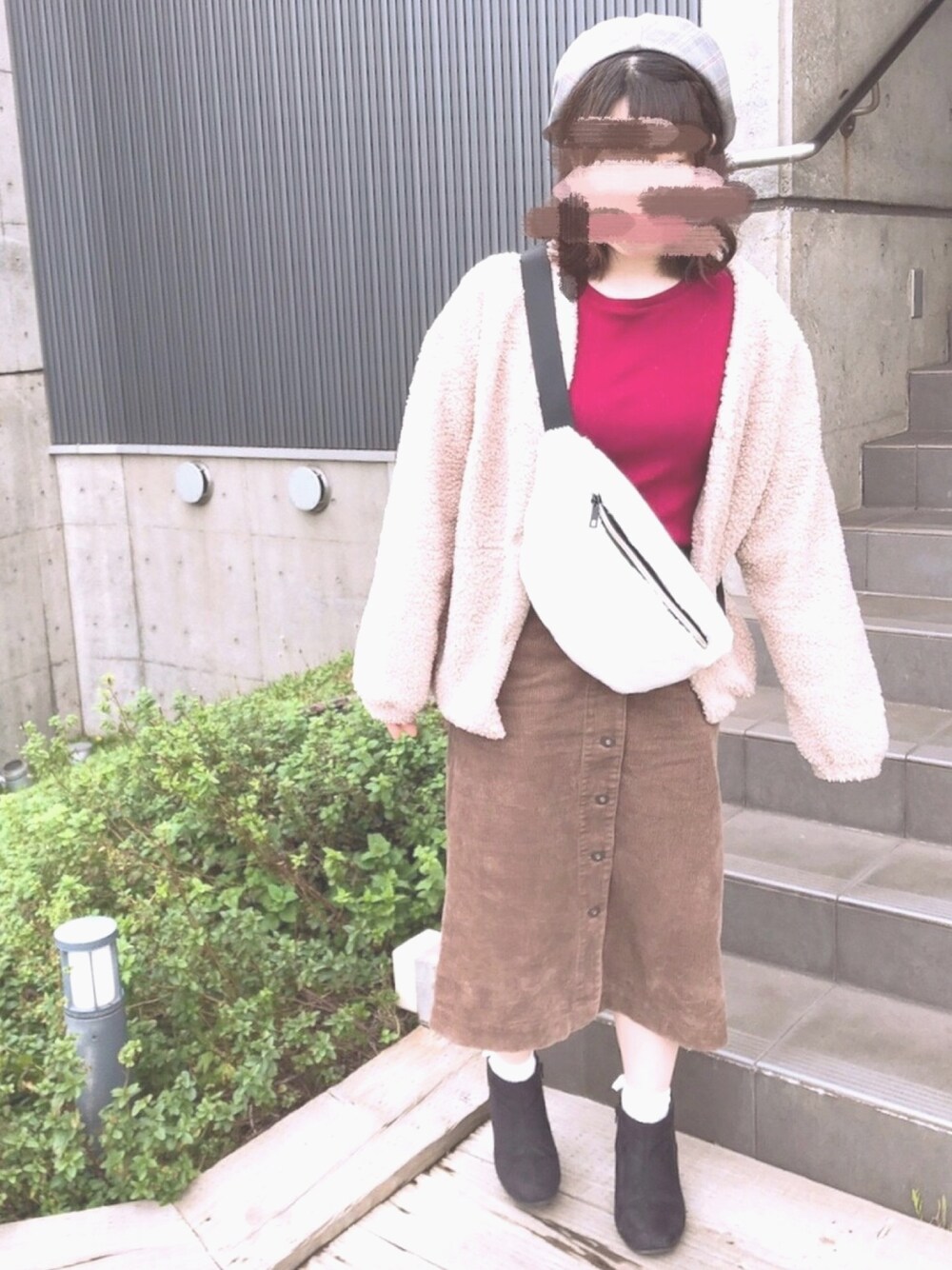red × brown × beige 秋らしい配色に、さらにグレンチェックの帽子で秋感をプラスしました🐿🍁 もこもこコーデで寒さにも対応してます◎🐑✩*॰ 見てくださりありがとうございます☺️💓