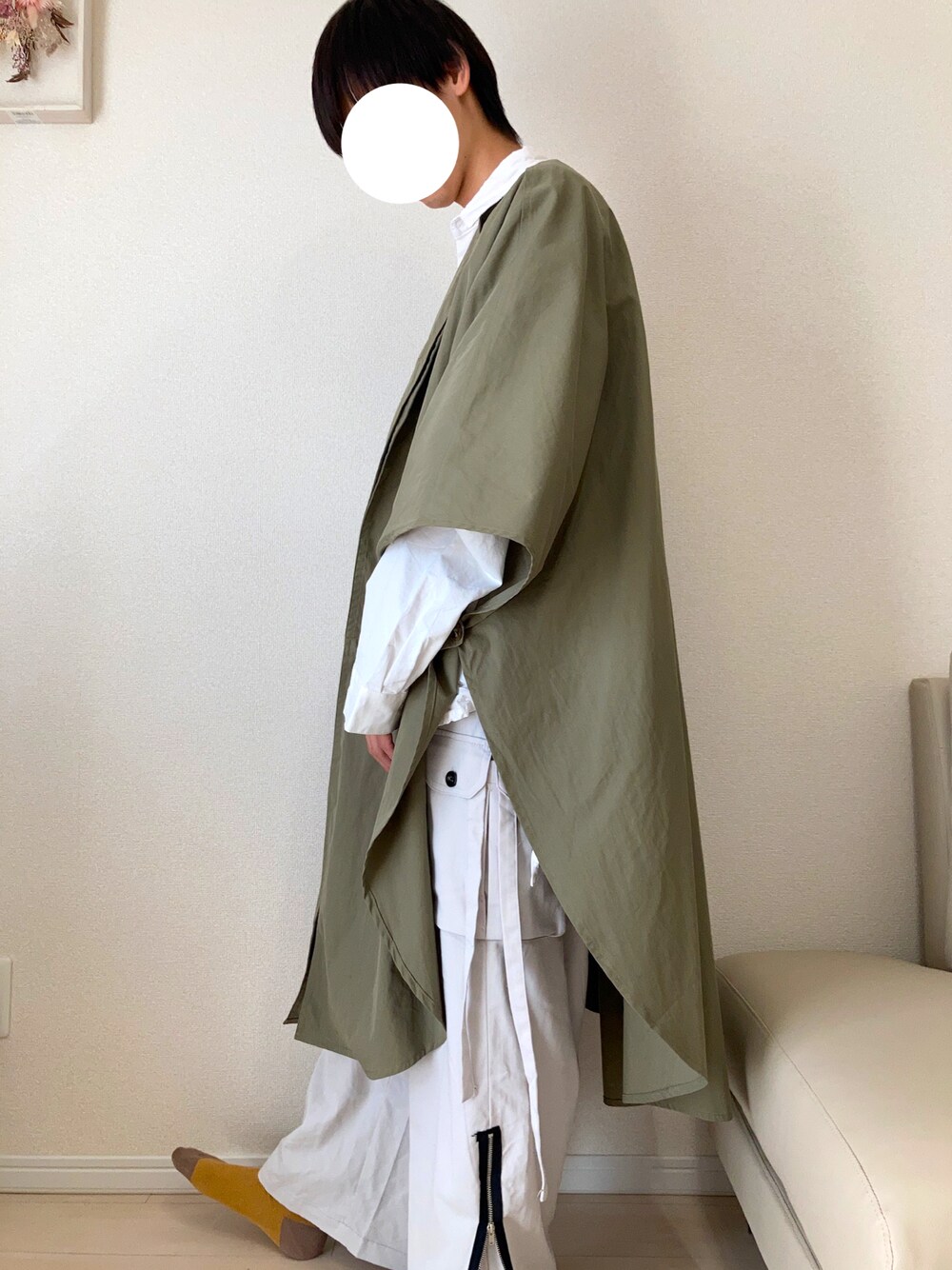 ポンチョレイヤードコーデ! ciaopanicのポンチョレイヤードコートとドローコード付きの白シャツをレイヤードしました。 パンツもコード付きなので、横から見た方が映えると思い、今回は横向きでの投稿です! このポンチョはレディースものなのですが、大きくてとてもゆとりがあるので、メンズでも十分着れます!