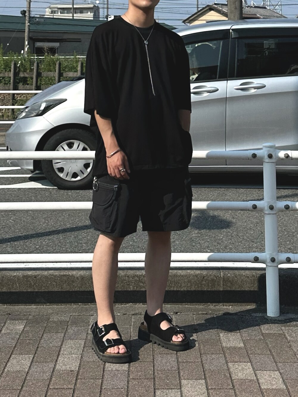 ハーフパンツとサンダルで季節感を出したオールブラックコーデです。 Tシャツはドルマンスリーブになっていて差別化も出来ます! 裾も絞れるので短丈にも出来ておすすめ!