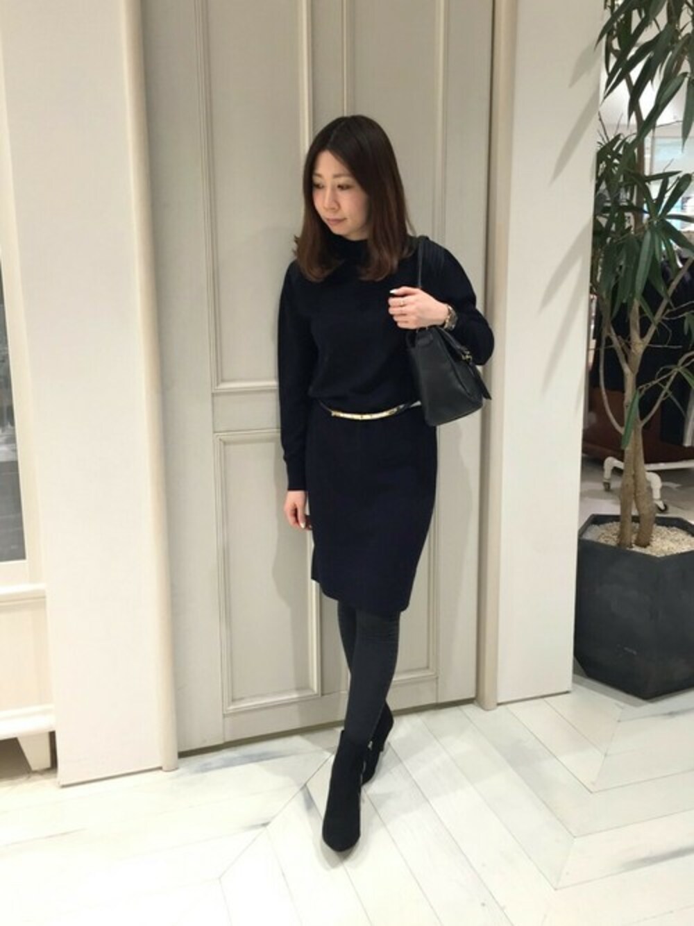 大人っぽく着れるニットワンピースです。ボトルネックと肩の部分のピンストライプがポイント。丈も長めで、ペチコートも付いているので安心です。