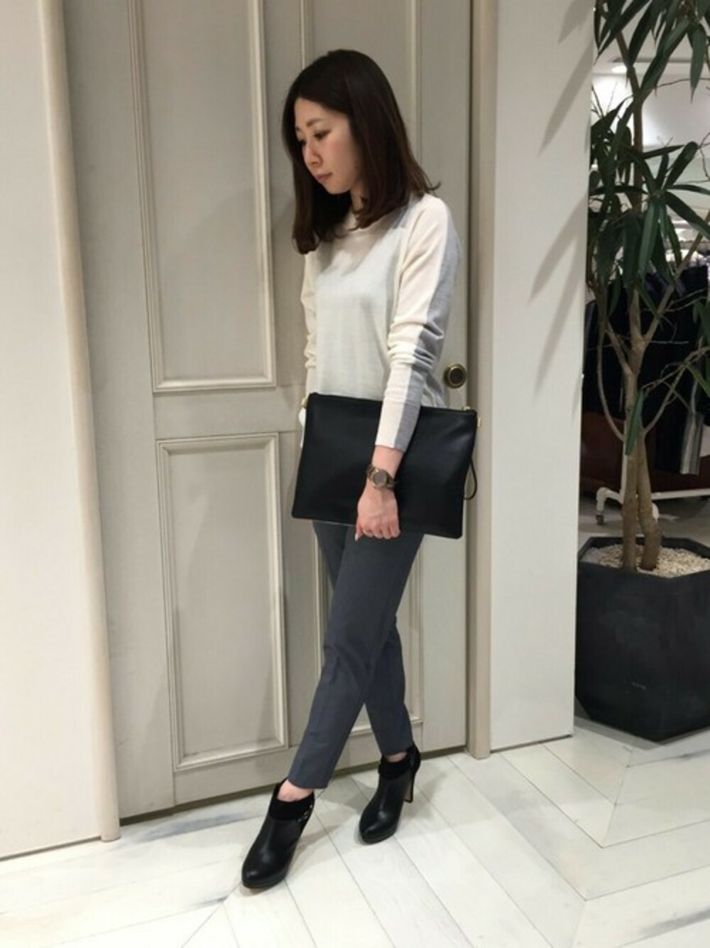 ニットはウールシルクで肌触りがとても良いです。肩の部分の透け感とバイカラーがカワイイです。パンツはジャージー素材ではきやすく、光沢感があるきれい目なシルエットなのでオンオフ兼用で使えます。