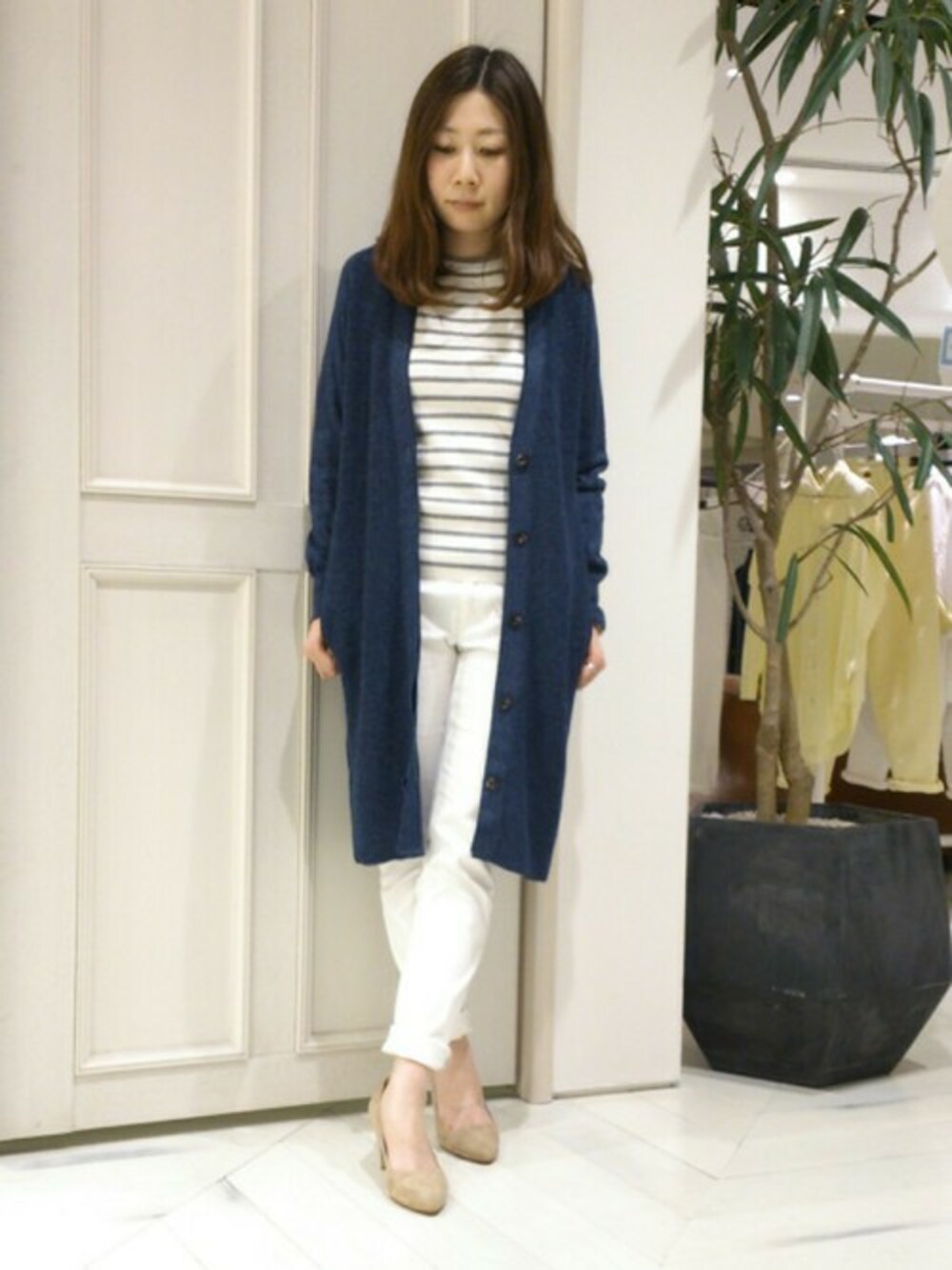 デニム調のロングカーディガン。長め丈で縦のラインがでてスッキリ見えます。白パンで爽やかなコーデにしてみました。