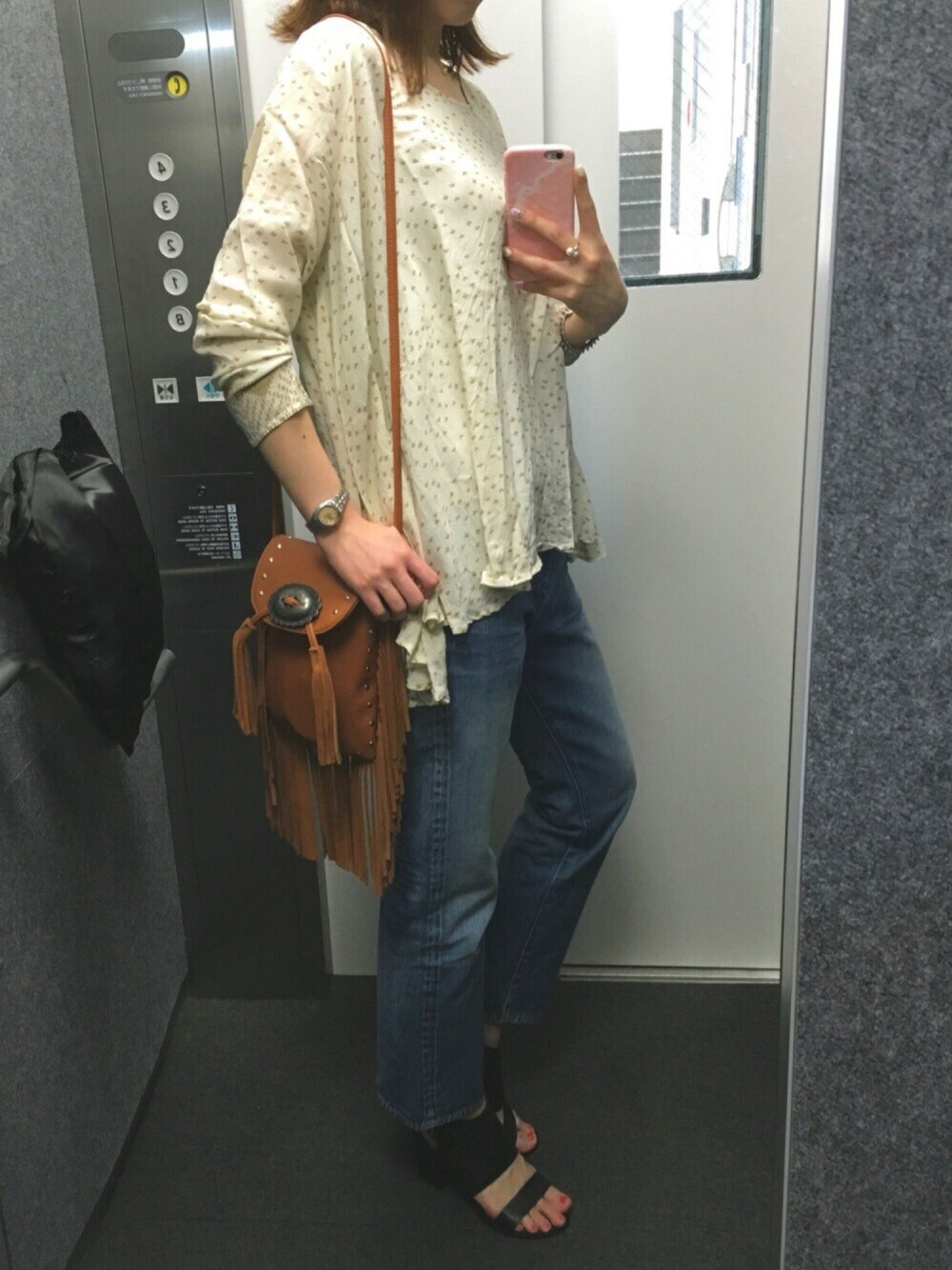 Mes Demoisellesのお気に入りブラウスをメインに。 裾の長さが前後で違っててボリュームもあるから、歩くとひらひら動きが出て◎ 全体的に淡い色なので足元はブラックで引き締めました。