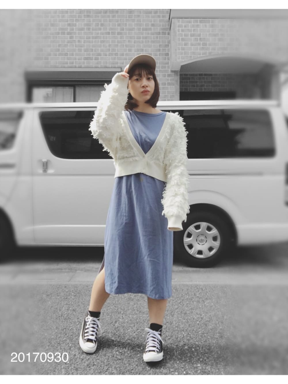 カーディガンってかわいいよね。 一気に女の子らしくなる。 ショート丈ってのもポイント高め。 だがしかし。 女の子らしいのは似合わないので キャップとスニーカーで調整。 ワンピースも今日はチュールなし。 この落ち着いたブルーがお気に入り。🙆♂️ カタカナコンバースは言わなきゃ気づかないけど、 それがいいんだ。😊 ここ2日間の天気サイコウ。