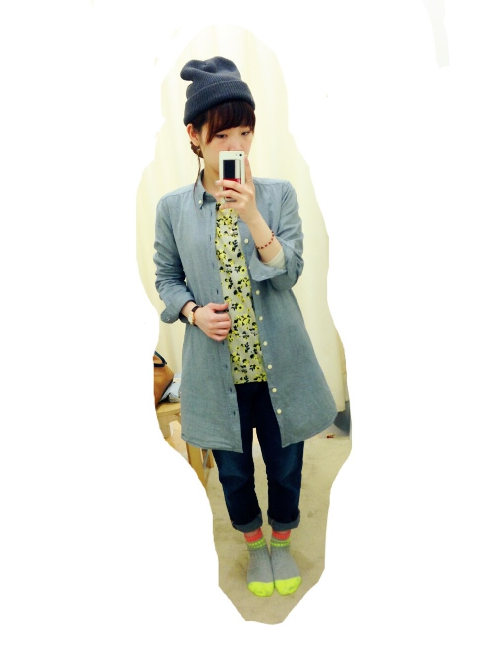 シャツワンピを羽織りにして着用🎶 困った時はニット帽!(笑)