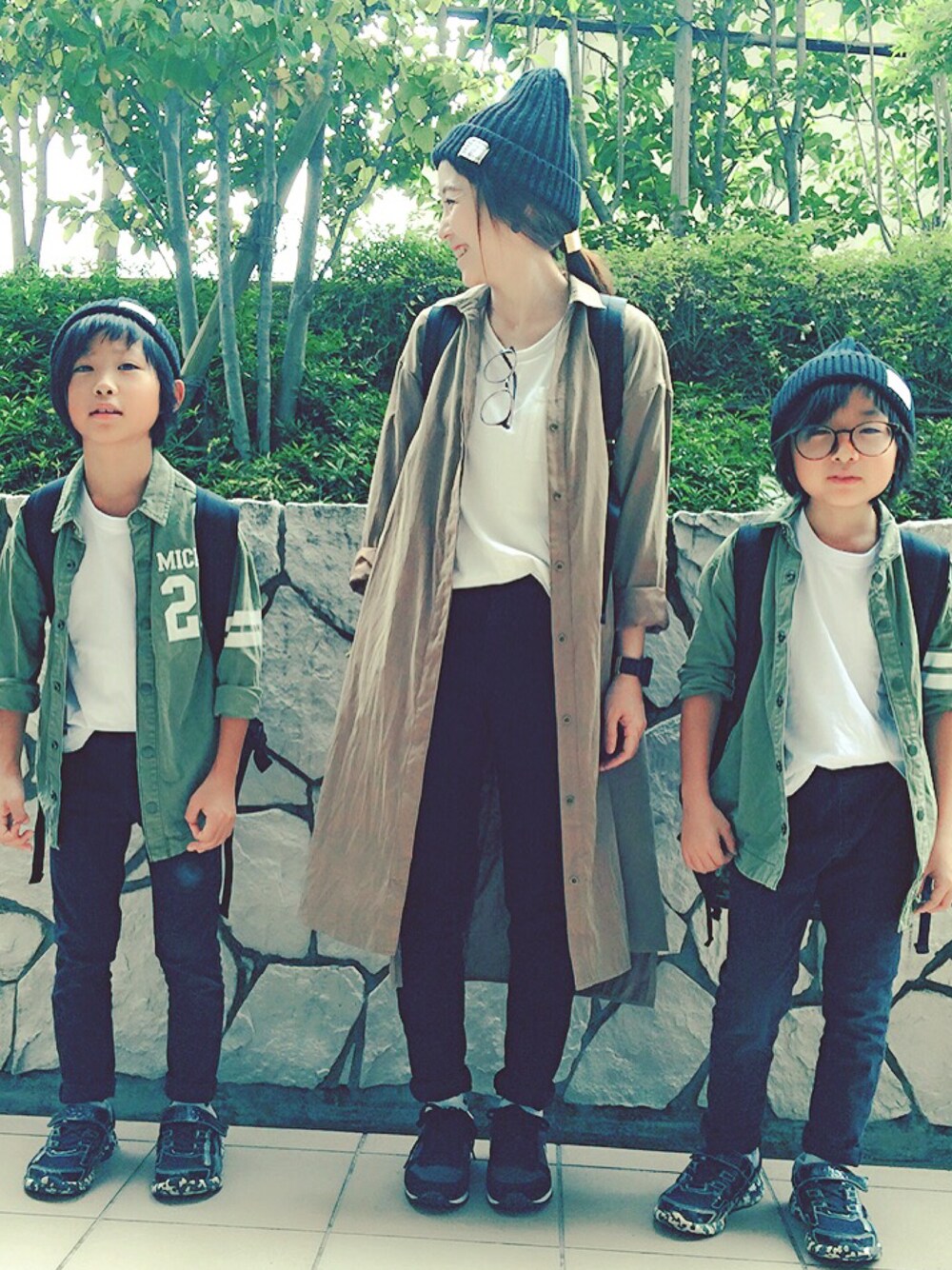 双子とリンクコーデ👬 カーキの色味が違うけど。