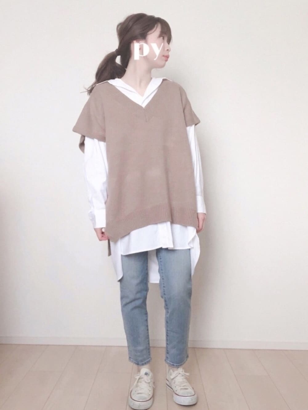 おはようございます✩.*˚ いつも 閲覧、いいね、お気に入り本当にありがとうございます♡♡ 今日はベスト×シャツ︎☺︎ ベストはapres jour mignonさんシャツAMERICAN HOLICさん𓂃𓈒𓏸 デニムはZOZOさんです♪♪ バッグはCONVERSEの巾着バッグ🌼