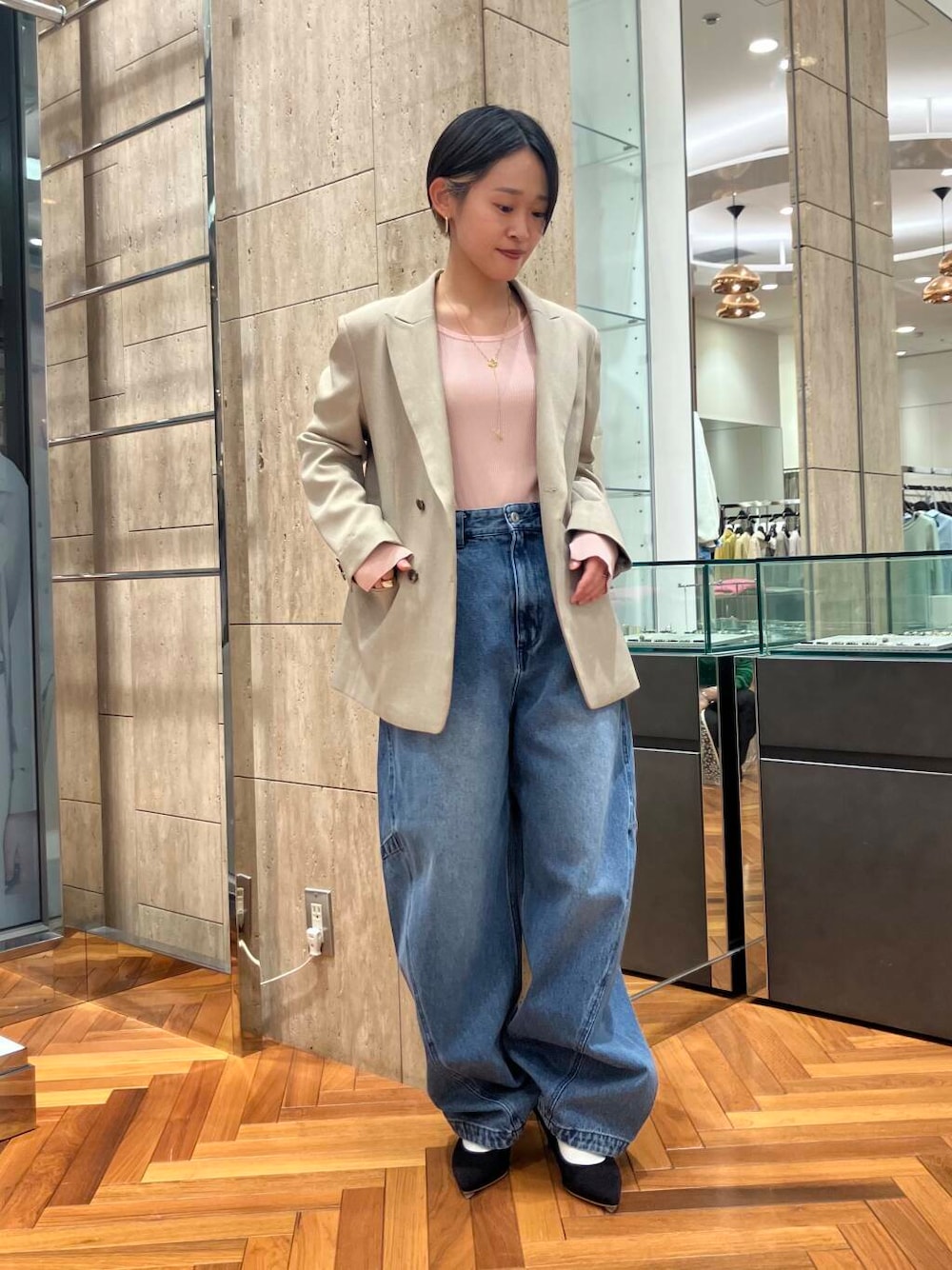 程よいオーバー感が可愛い ツイードライクジャケット◎ 同素材のハイウエストパンツも 形がきれいでおすすめです! シーン用にと使えますが、 デニムとカラーニットでカジュアルに♩