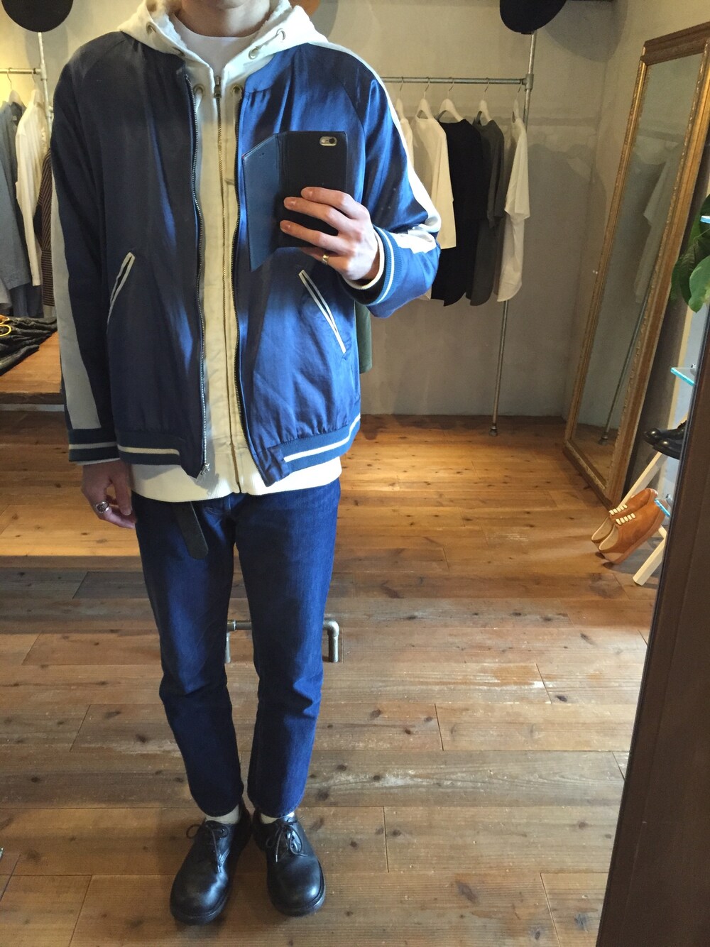 予想外の寒さにより、いつもの格好にパーカーを挟むだけ