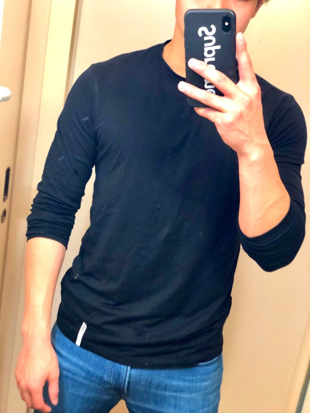 シンプルすぎて笑 筋肉質な方とか、スポーツやってる方は ジーンズに長袖一枚🤩 シンプルだけど少し品のある感じになると思います🥳 これに後1枚、パーカー羽織って終了