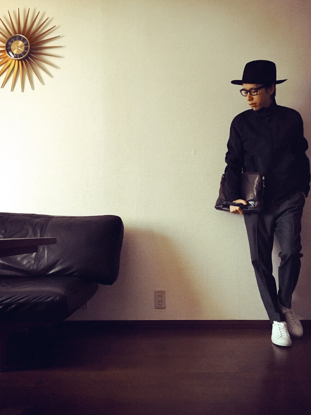 スポーティーなアクネのブルゾンにグレーのスラックスで少しモードに寄せてみました。足元は重たくならないように白のスニーカーで。