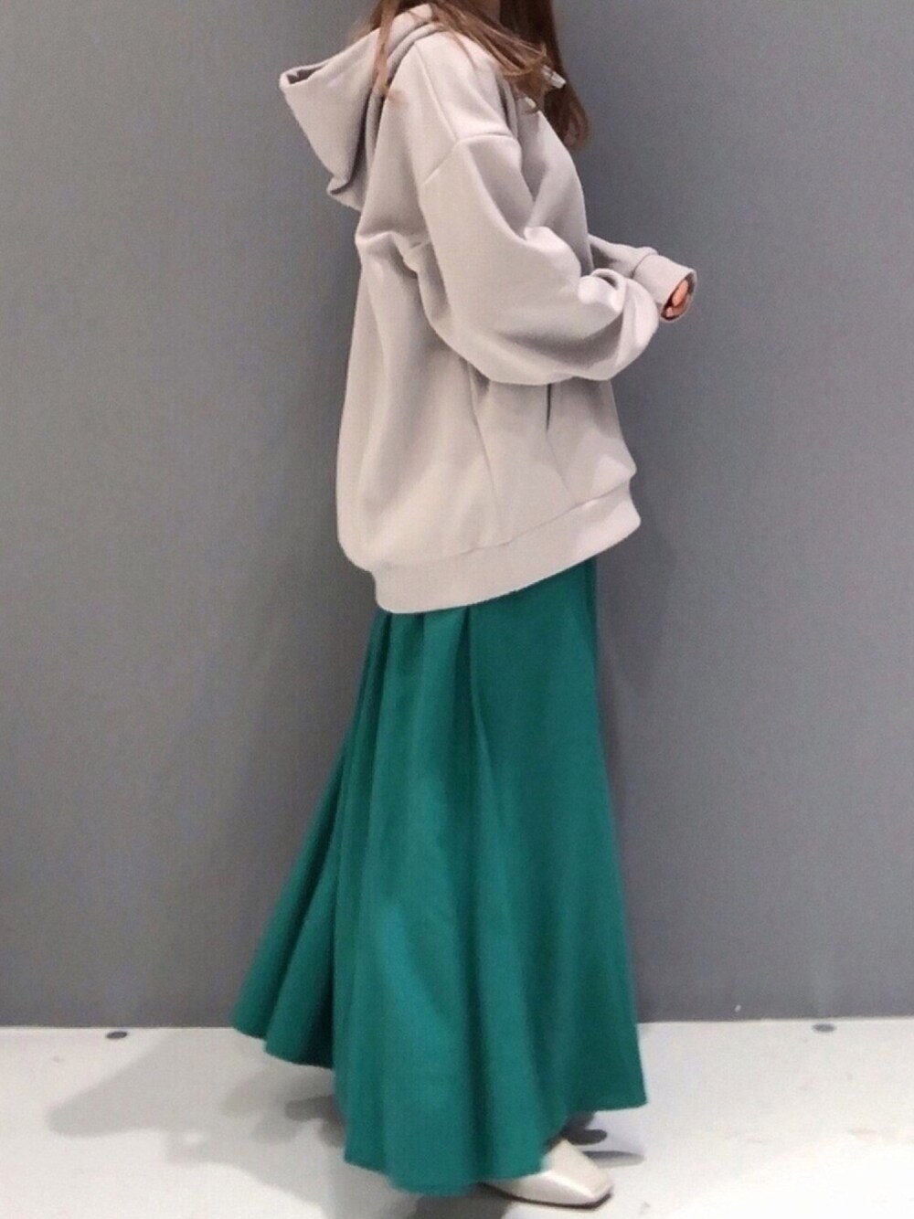 ⬜️🟩⬜️ メンズパーカーにスカートを合わせて ゆるっと華奢見えコーデにしました☆ 水泳経験+わがままボディで 肩まわりガッチリしてますが 柔らか素材のこのパーカーなら 着痩せして見える気がします☺︎ スカートもフレアが途中からなので 広がらず下半身をすっきりみせてくれます☺︎