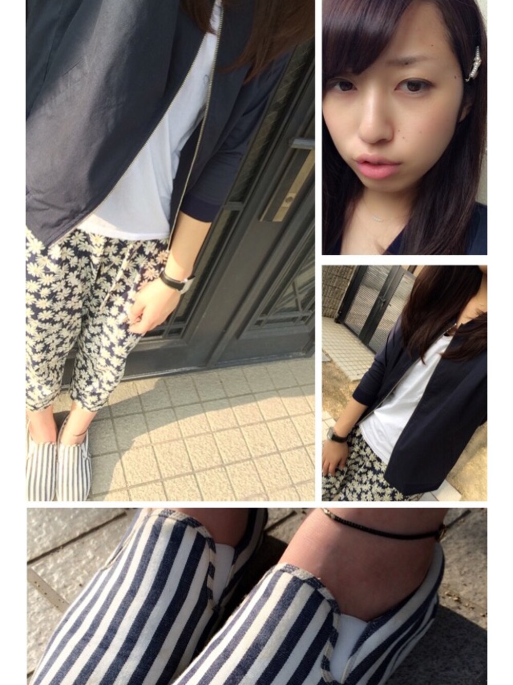 カジュアルめに ◎ ストライプのスリッポンはお気に入り ぺたんこで歩きやすさも ◎ 柄×柄でも 間に肌見せすれば あり と思ってます 笑 首元は華奢なネックレスですっきり