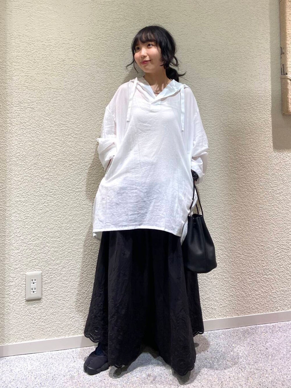 ◯シアーフーディチュニック ・今の季節にも嬉しい、軽やかなシアー素材 薄手ですごく軽いので、わりと涼しく着られました! フード付きで首の後ろも覆えるため、 自転車に乗る時の日焼け対策にも重宝しそうです! ・小柄な方はあえてオーバーサイズを楽しむのも◎ なかなかゆったりサイズですが落ち感があり、 意外と着られてる感は出にくなっています。 オーバーサイズでもメンズライクになりすぎないように、 刺繍パンツを合わせて華やかさをプラスしてみました♩ ◯刺繍ティアードパンツ ・リラックス感のあるふんわりシルエット 軽くて締め付け感もなく、リラックス感のある履き心地です。 こんなにラクなのに上品さもあって、 オシャレに映えるのが良いですよね♩ ・高身長な方にもオススメな長め丈 145cmだと、腰で1〜2折りは必要な長さでした。 今回のように長めのトップスで隠してしまえば、 シルエット崩れもほとんど気にならなかったです!