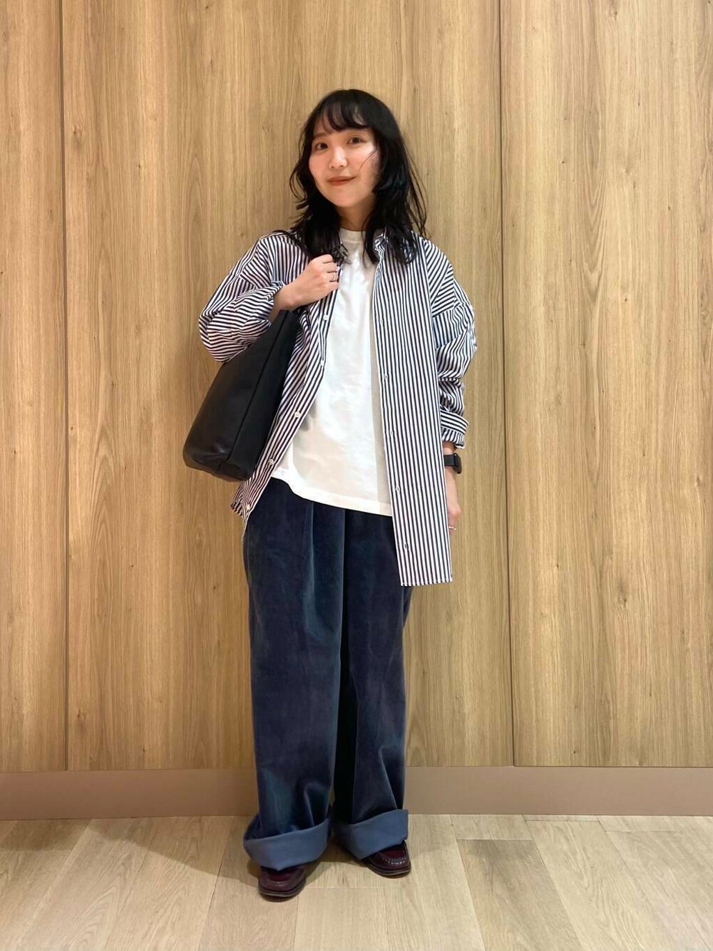 今回は少しメンズライクな雰囲気で組んでみました! シャツはゆったりめなので、小柄な方は羽織として活用すると比較的バランスが取りやすいかと思います◎ お袖は2回折っているのですが、違和感なく着られました! パンツは絶賛愛用中のリアルバイアイテム! 丈は長めのため、腰か裾で2回折って着用しています! ストライプの色に合わせてBLUE系でまとめてみました! 一見サイズが大きいアイテムも、あえてオーバーサイズで着たり、合わせ方次第で小柄な方でも取り入れやすくなったりもするので、一緒に低身長を活かした着こなしを楽しみましょう☀︎