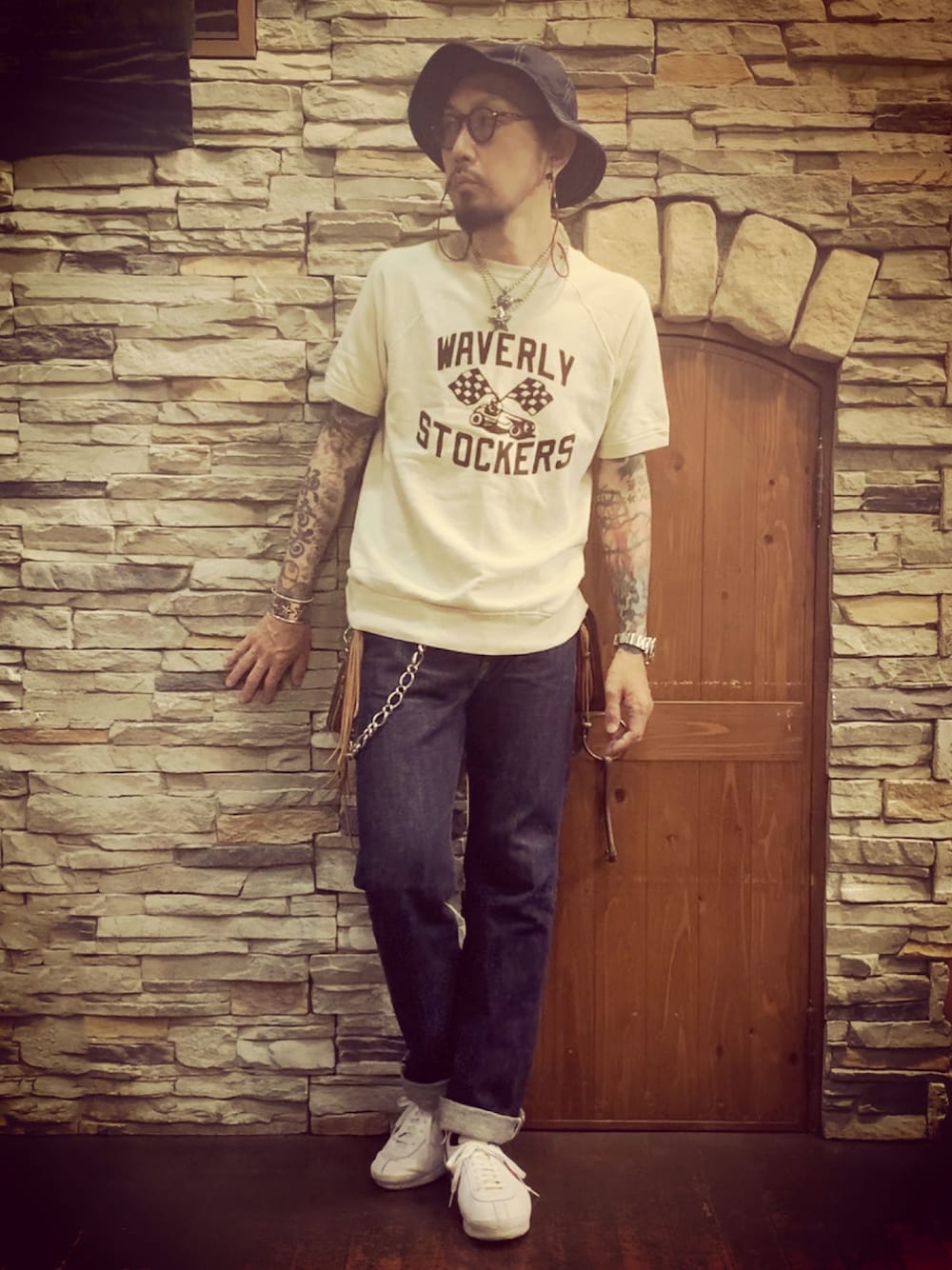 ホワイト系のスウェット、ブルー系のデニムパンツ、ホワイト系のスニーカーを着用したメンズの春コーディネートの1枚目の写真