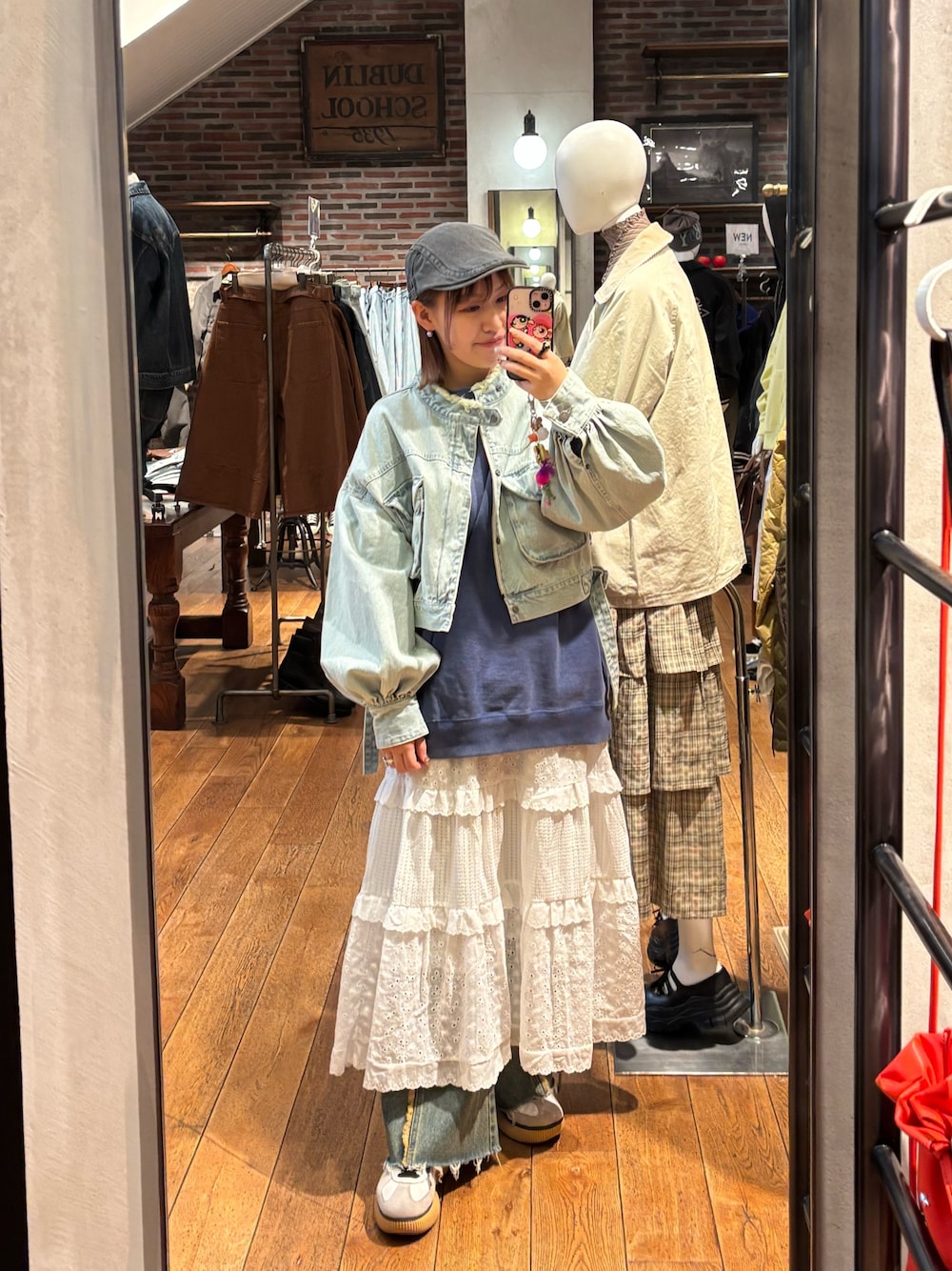 骨格ストレート/158cm ○着用アイテム:ジャケット ・生地感▶︎デニム素材 ・サイズ感▶︎ショート丈 ○着用アイテム:スカート ・生地感▶︎レース素材 ・サイズ感▶︎ふくらはぎくらいの丈感