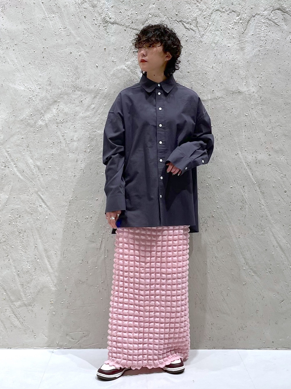 グレー×ピンクの春スタイル🌸 ゆるっとオーバーシルエットのシャツは 着回し力抜群です🙆♀️ ピンクのポコポコスカートは スタイリングの主役になってくれるアイテム! ストレッチも効いてて履き心地◎