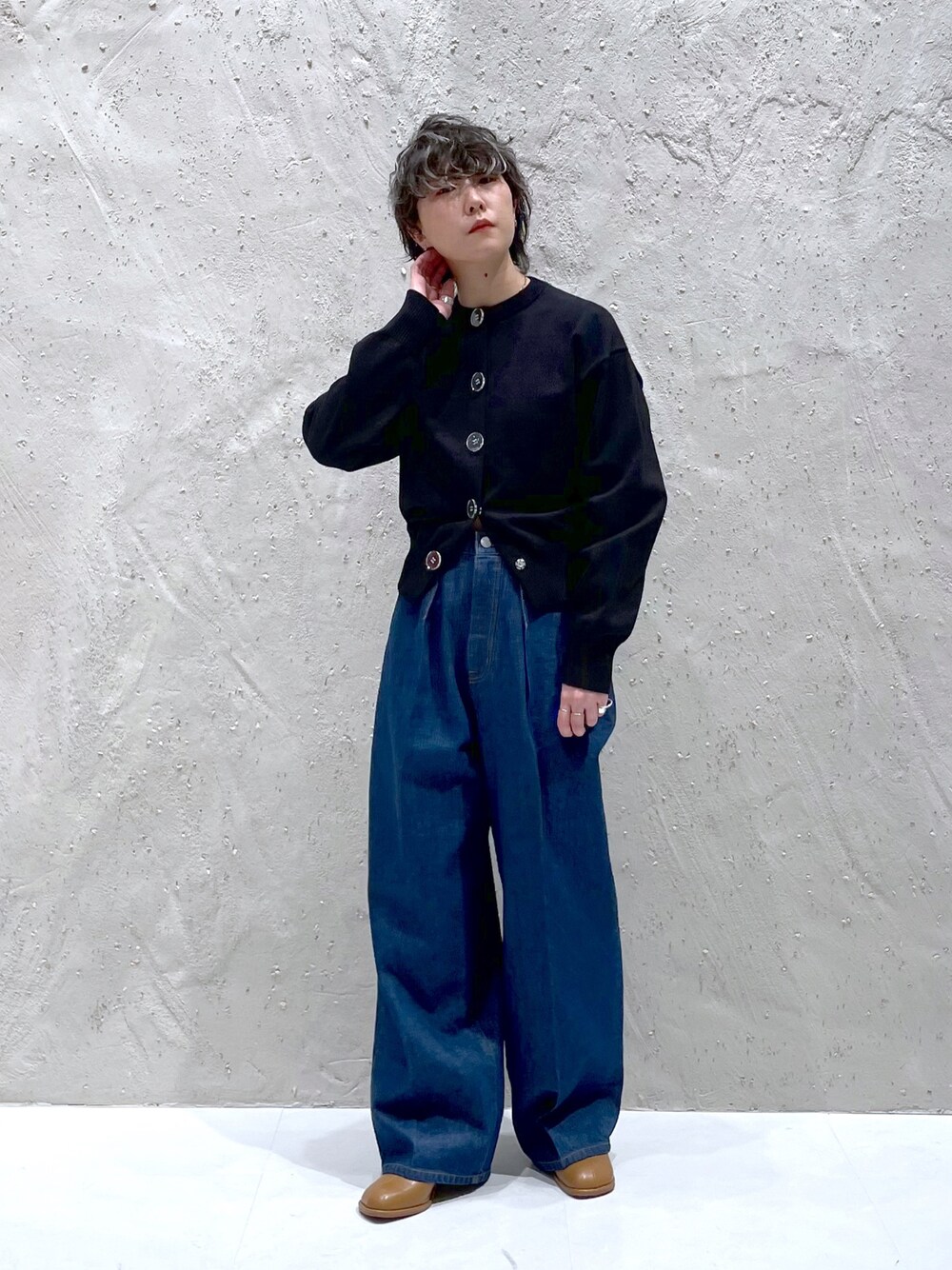 大人カジュアルスタイリング✌️ カーデは大きめのクリアボタンが可愛い! 1番下のボタンだけ外して ウエストがより細く見えるようにしてます✌️