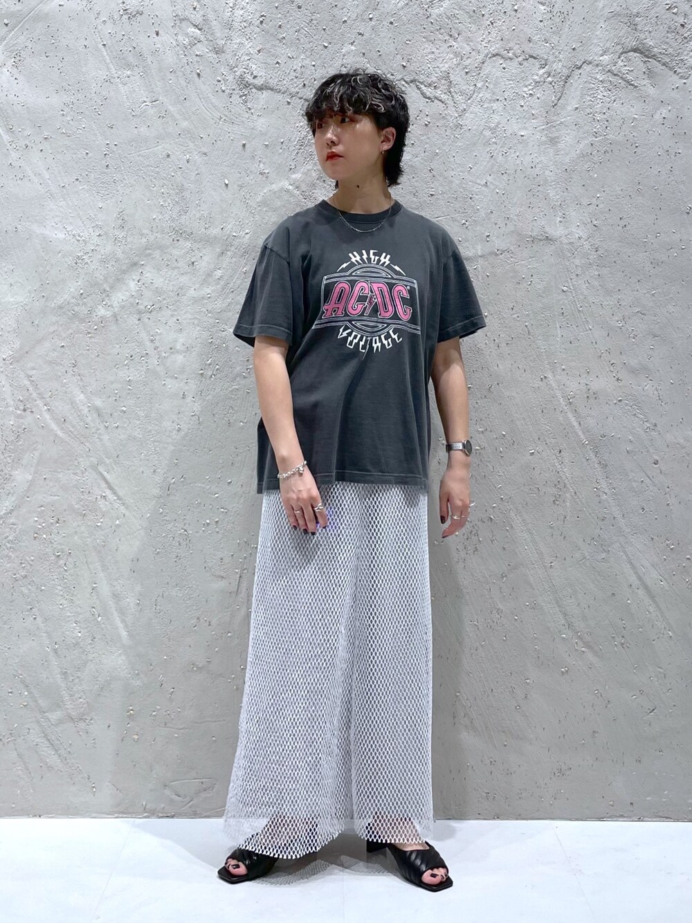 ロックTeeコーデ🎸 ヒップが隠れるくらいの着丈で いろんなボトムスと合わせやすいです◎ スタイリングのポイントになってくれるメッシュスカートは 裏地も取り外せてマルチに使えます!