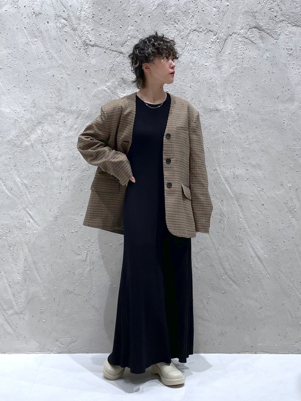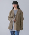 オーバーサイズジャケットに コンパクトなニットワンピを合わせた 大人カジュアルスタイリング💐 しっかりハリのある綺麗なシルエットの ノーカラージャケットは 見た目以上に軽くさっと羽織りやすいです◎
