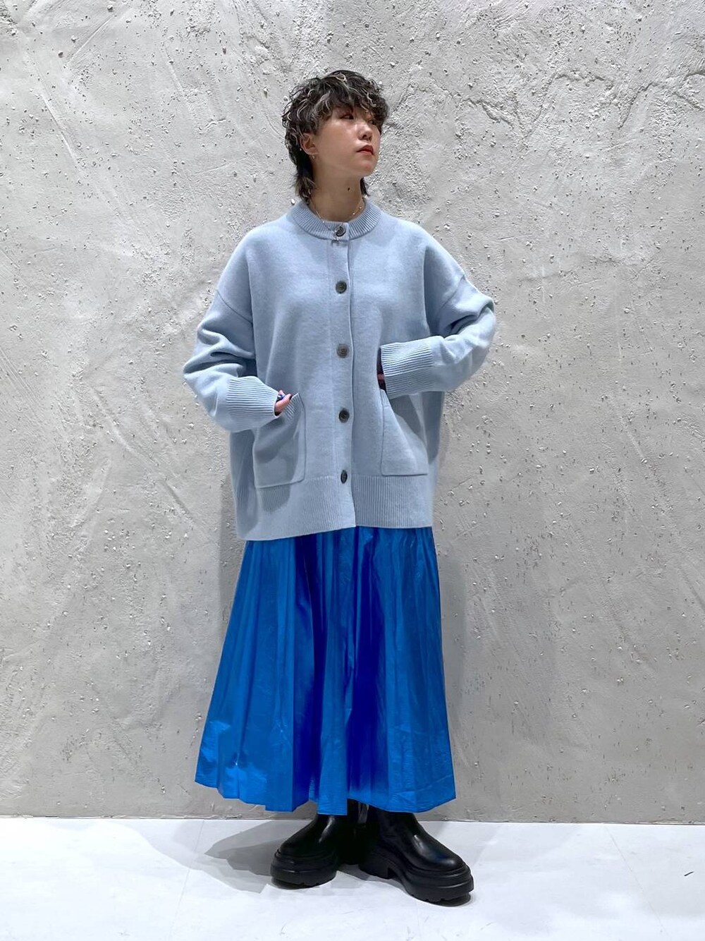 ブルーコーデ🫐 全体的にゆったりとしたシルエットなので 足元はブラックで引き締めました◎ カーディガン▷ ユニセックスで着用可能なサイズの クルーネックカーディガン 柔らかいブルーはキレイめからカジュアルまで 幅広いスタイリングに合わせやすいです 肌あたりがとても柔らかく、着心地が抜群です! ニットのチクチク感が気になるという方も 着ていただきやすいアイテムになってます スカート▷ yuwで毎シーズン人気のプリーツスカート 光沢がキレイで鮮やかなブルーカラーは スタイリングの主役になってくれます とても軽い素材感のお作りで 通年通して楽しめるアイテムです! yuwのアイテムたくさんupしてます☺︎ ≫