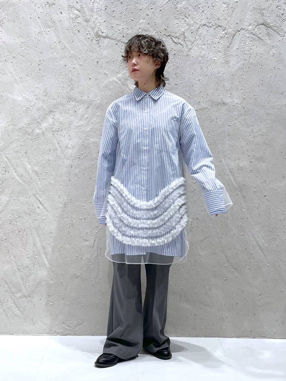 シャツとスラックスのハンサムな組み合わせに チュールトップスをレイヤードした 今年らしいスタイリング💐 チュニック▷ 裾にあしらわれたフリルデザインが素敵なチュールトップス ゆったりしたサイズ感でレイヤードに最適です◎ カジュアルなオーバーサイズのTシャツや シャツに組み合わせるのがおすすめです☺︎ 目の細かいチュール素材で少し光沢もあり 繊細な透け感がとてもおしゃれに見えてくれます!