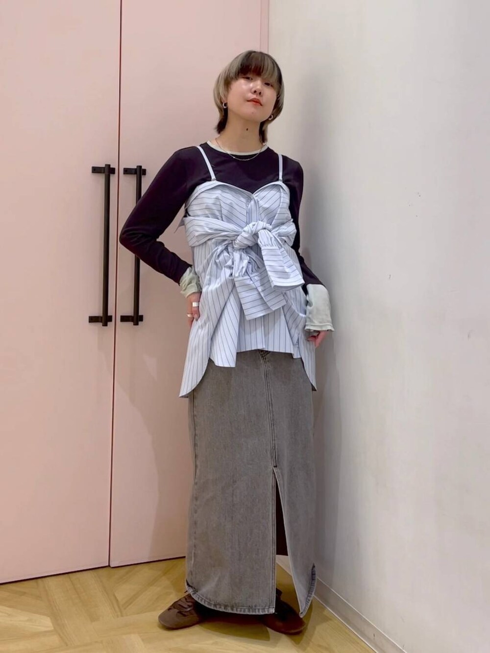 シャツアレンジコーデ👔 インナー▷ 襟と袖もとの配色が可愛いカットソーです◎ 柔らかく適度な透け感があり、 組み合わせるだけで春らしいコーデになってくれます🌸 タイトすぎずゆとりもあるので 身体のラインが出ないのもポイントです! シャツ▷ ビスチェにもなるストライプシャツ👔 ハリがある素材でへたらないので、 シルエットがとても綺麗に出てくれます! ポリエステル混なのでシワになりにくく、 袖をキュッと結んでもシワシワにならないです◎ オーバーサイズなので春先の羽織にもなり、 様々なスタイリングが楽しめますよ🌼 スカート▷ リアルバイしたデニムスカート! ウエストのアシメデザインが可愛いです◎ 腰回りはすっきりしつつ 裾に向かってAラインに広がるので、 細見え効果も抜群です🙆♀️ 柔らかく馴染みやすいCONEデニムなので、 ウエスト周りもどんどん自分の体型にフィットしていきます✨ ----------------------------------------- いつも見ていただきありがとうございます🌞 大人っぽいけどどこか個性のある スタイリングが好きです🥳 たくさんUPしてますのでぜひフォローしてください◎ ≫ Instagramは私服もUPしてます👦🏻 ぜひフォローしてくれたら嬉しいです☺︎ ≫ 新小松店の大人かわいいスタイリングはこちらのスタッフにお任せください💐 ≫