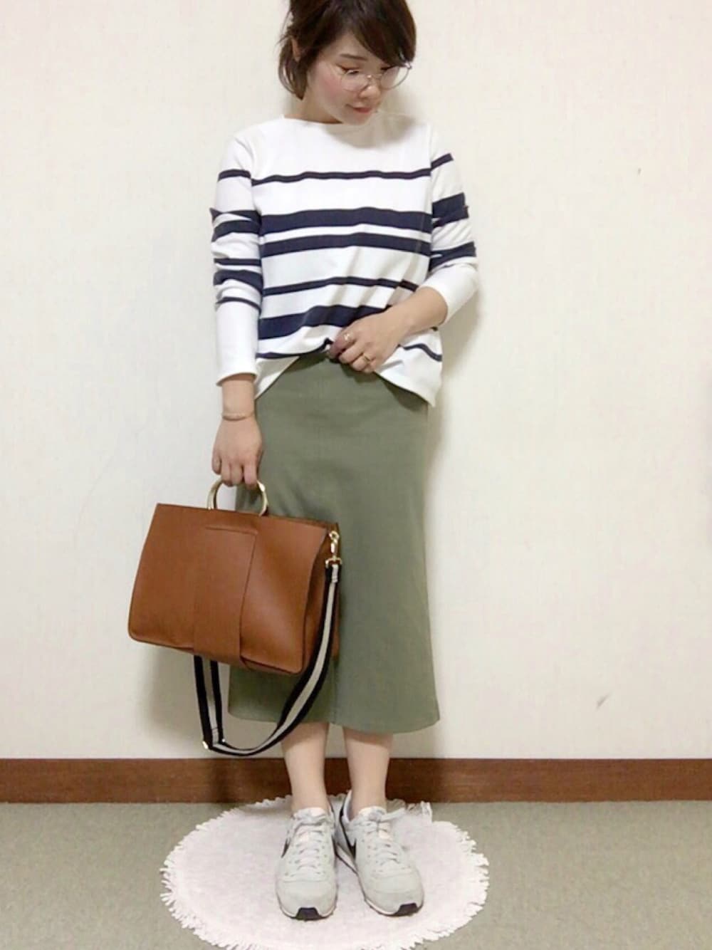メガネを外し忘れてしまいました😅 メガネはガチのやつで、 週6はメガネちゃんです👓 コーデは、トップスのボーダーが ランダムなのが大人っぽくて気に入ってます💋 スカートもストレッチが抜群な上、 スリットが入ってて、動きやすさ💯点! 休日の楽チンstyleでした♨️