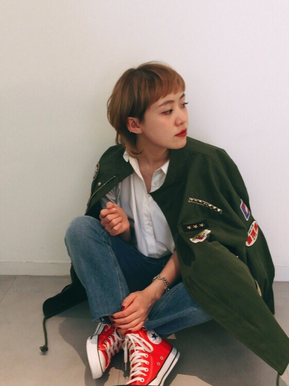 グリーン系のミリタリージャケット、ホワイト系のシャツ/ブラウス、ブルー系のデニムパンツを着用したレディースの春コーディネートの1枚目の写真