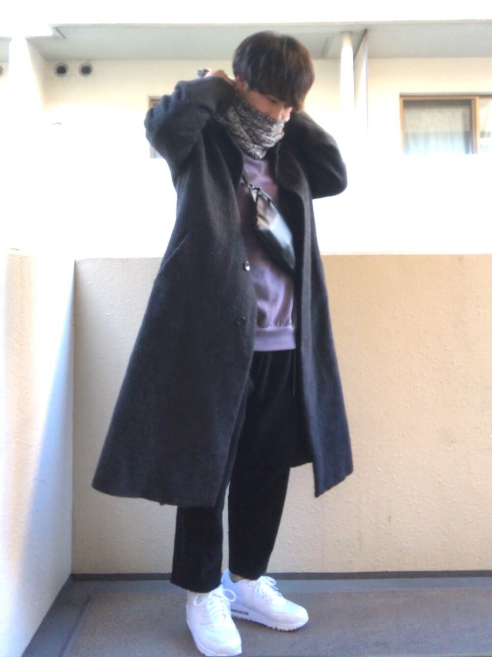 久々投稿です! 寒いので裏起毛スウェットにベッチン素材のパンツを履いてます 防寒対策かつおしゃれに! オーバーコートも暗めを選び、全体的に暗い印象にしつつスニーカーで外しのオールホワイトのシューズを選びました!