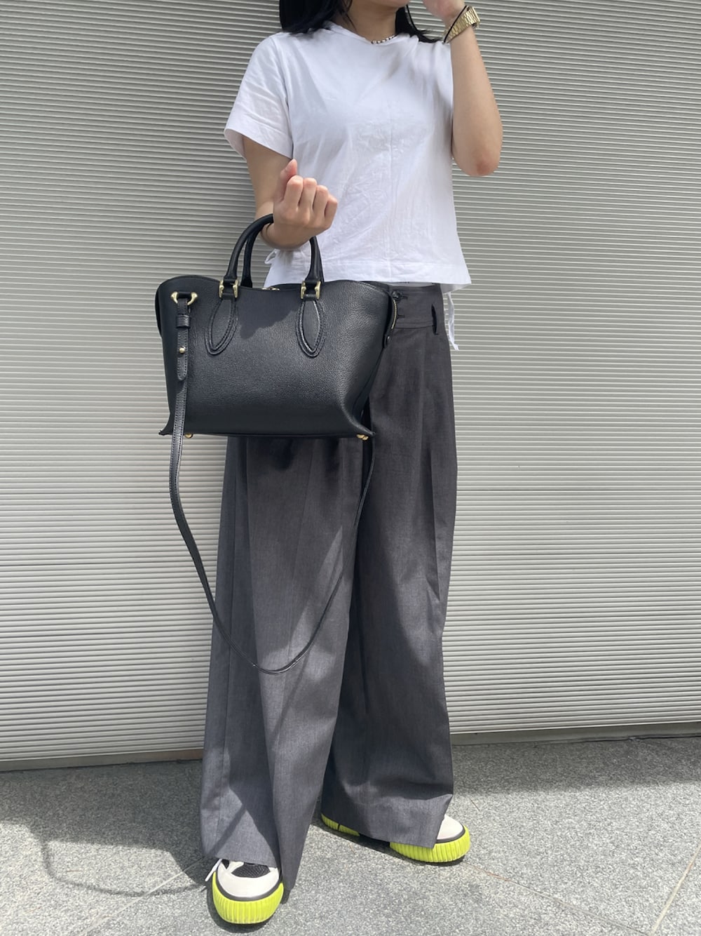 広い口開きを生かしたファスナーの付き方でトートの使いやすさと、しっかりと間口がしまる機能性を兼ね備えたバッグ。 ショルダーストラップ付きの2wayで、肩掛けした時はハンドルが倒れる仕様。 使いやすさにも配慮しています。 ハンドバッグの印象とトートのラフさのいいとこどりでデイリーユースはもちろん、通勤スタイルにもマッチするサイズ感です◎