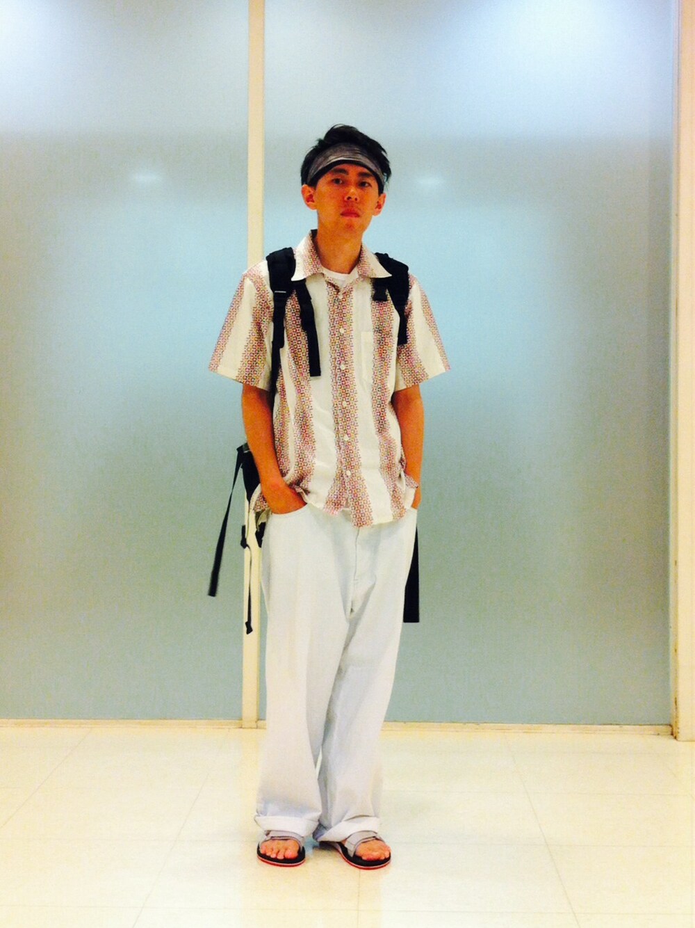ヘアバンド:THE NORTH FACE 開襟シャツ+ワイドパンツ+サンダル= 本日も奥様から不評(T_T)