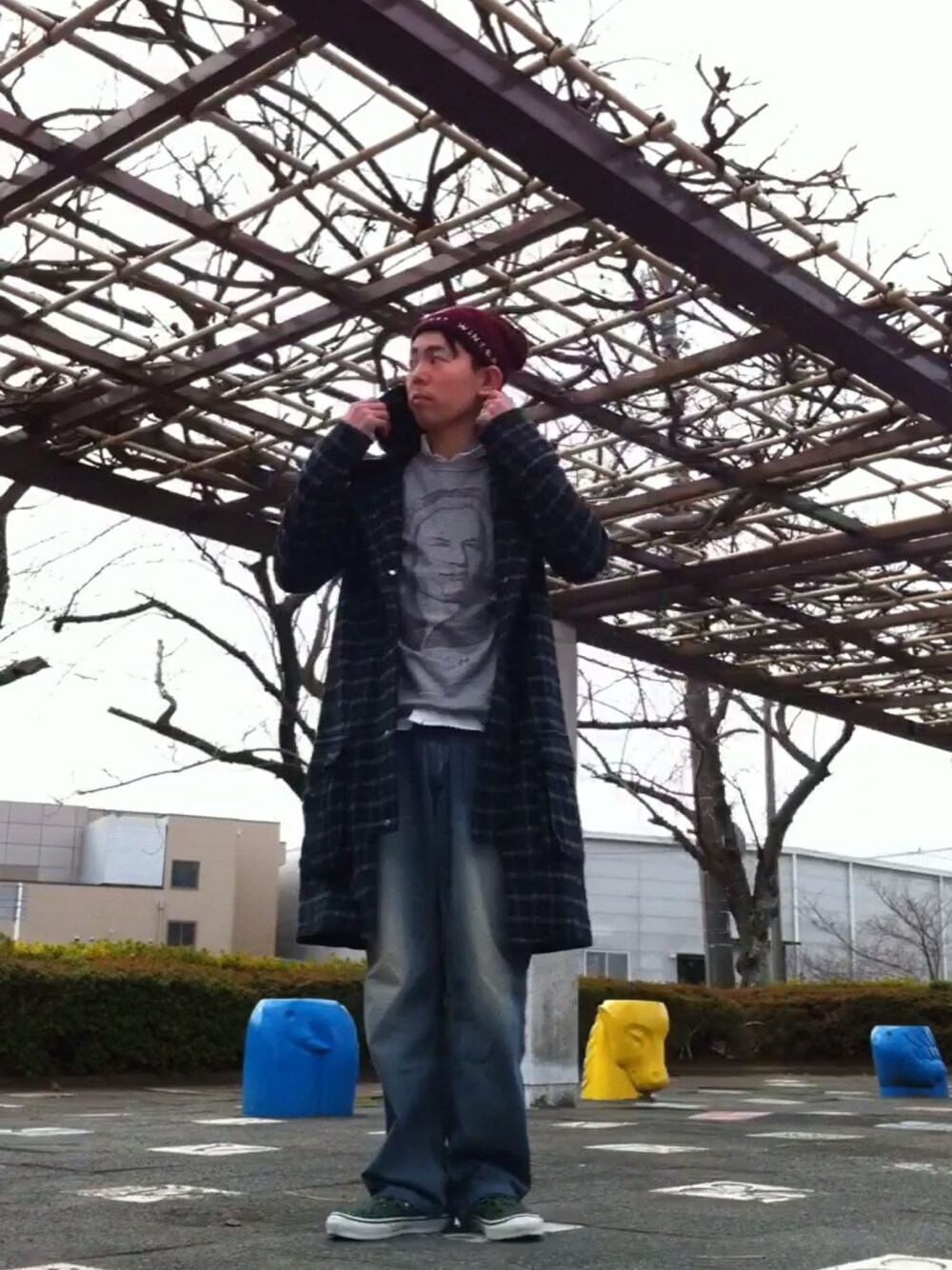 ニット帽-soe コート-Sise シャツ-無印 スウェット-used デニム-Lee×N.hollywood シューズ-VANS×UNDERCOVER スパンキー×チェック×バッハ(笑)