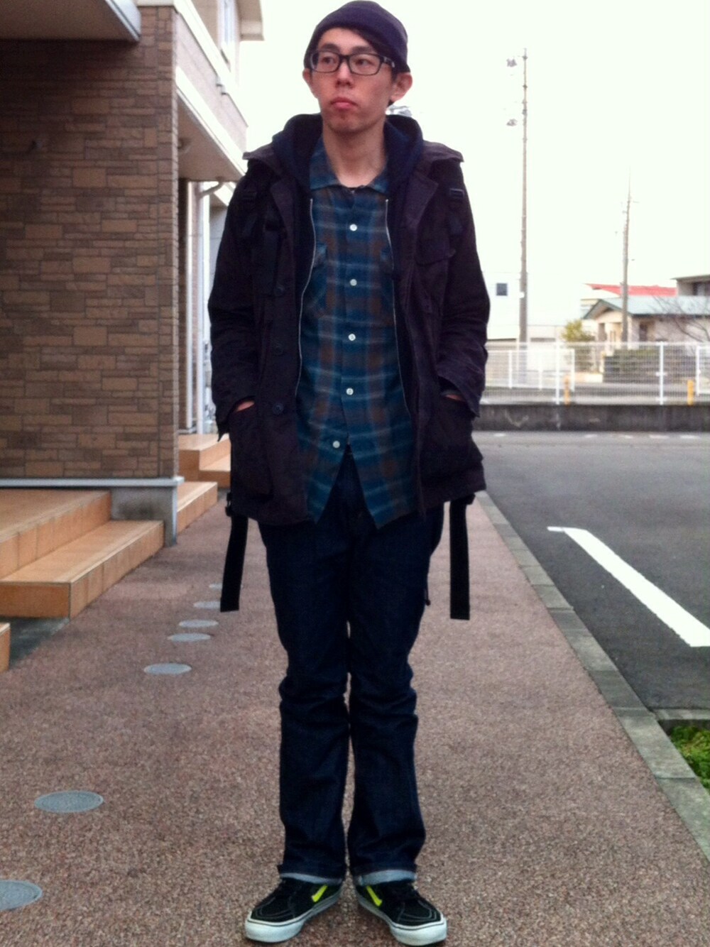 ニット帽:NEW YORK HAT M65:GoodEnough シャツ:(W)tas シューズ:VANS×UNDERCOVER バックパックに忍ばせたエコバッグ:(W)taps スーパーへの買い出しコーデw エコバッグはこれとアメアパが基本ですwww