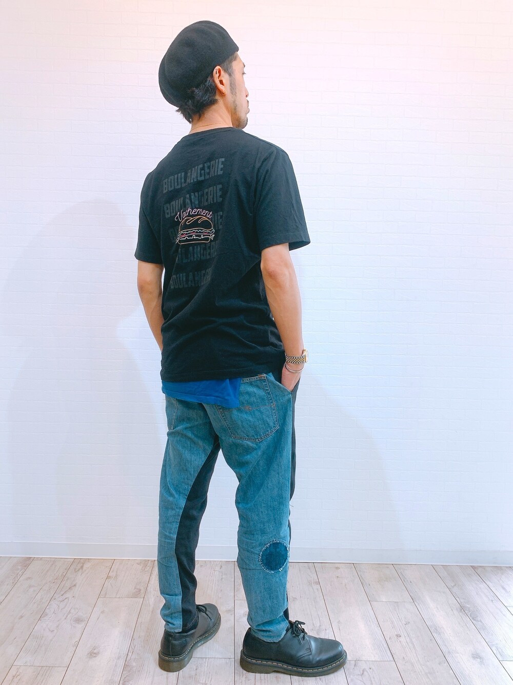 パンツはフロント半分自前のスーツのスラックスとバック半分はTAUのデニムを友人にアレンジしてもらったもの! 前から見ると全身ブラックコーデに見える! 大人の遊び心